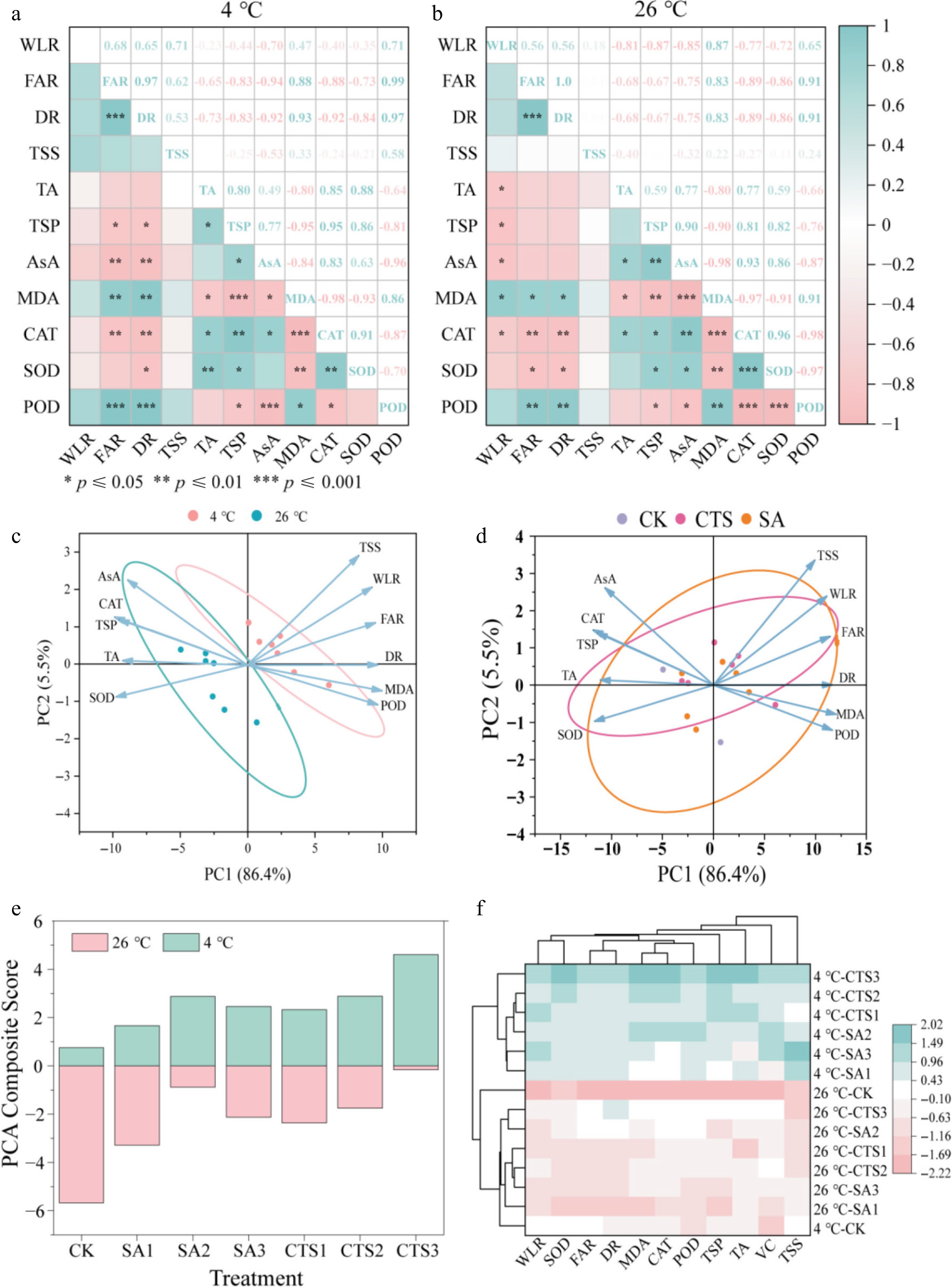 • PCA of 11 quality indicators revealed that coating preservation efficacy for grapes was predominantly governed by two components explaining 91.9% of the total variance (Fig. 5c, d). PC1, associated with external quality, showed positive loadings for TSS, WLR, FAR, DR, MDA, and POD, and negative loadings for AsA, TSP, TA, CAT, and SOD. Quantitative evaluation based on weighted PCA scores confirmed that preservation efficiency was significantly greater at 4 than at 26 °C for all treatments (Fig. 5e). Notably, the CTS3 coating consistently achieved the highest comprehensive score across both storage temperatures, identifying it as the most effective treatment, followed by SA2.