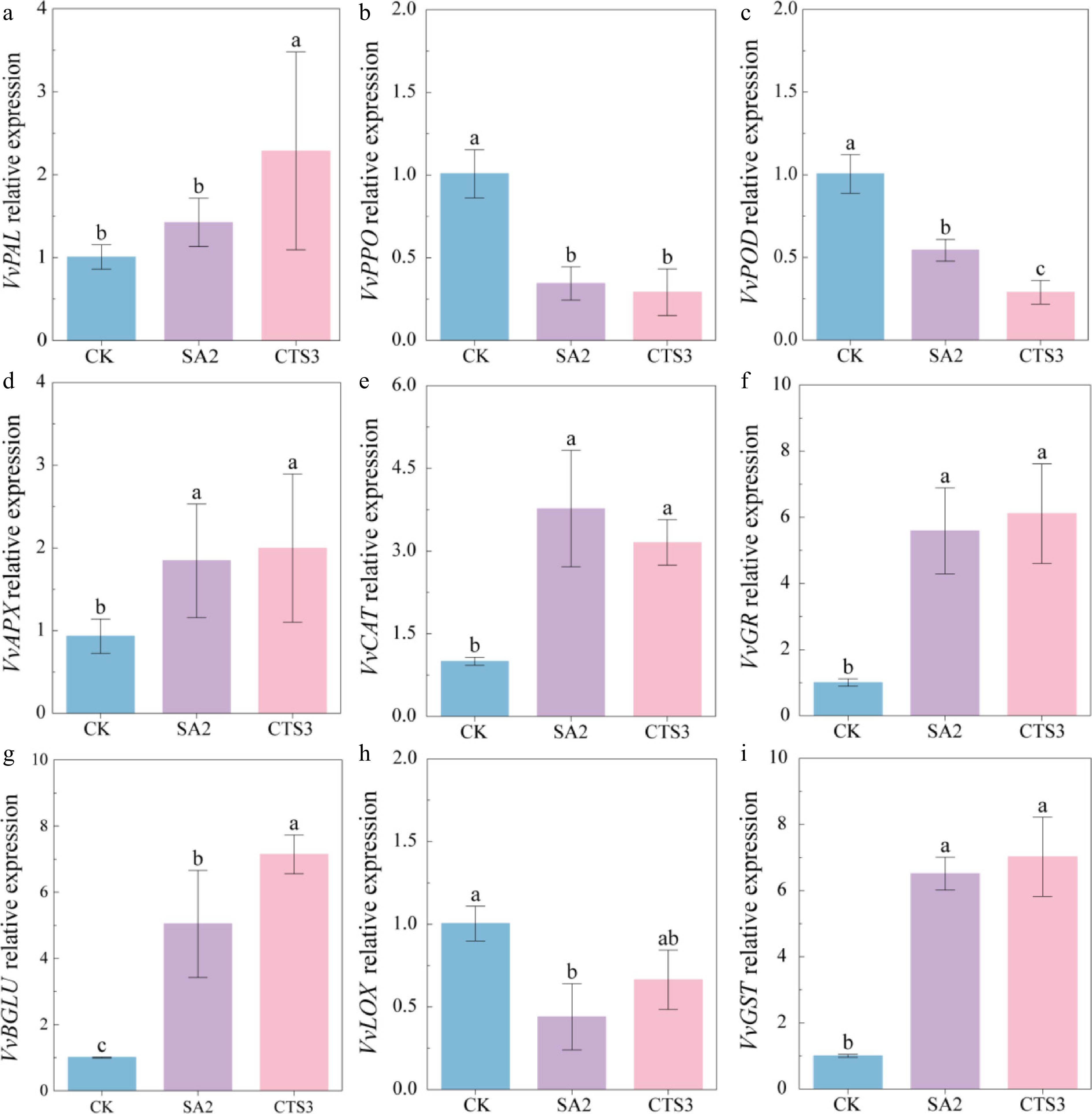 Effects of SA2 and CTS3 treatments on the relative expression levels of disease-response genes in grapes inoculated with Aspergillus niger. (a) VvPAL; (b) VvPPO; (c) VvPOD; (d)VvAPX; (e) VvCAT; (f) VvGR; (g) VvBGLU; (h)VvLOX; (i) VvGST. Data is presented as mean ± SD, n = 3. Different letters indicate significant (p < 0.05) differences between the control and treated samples.