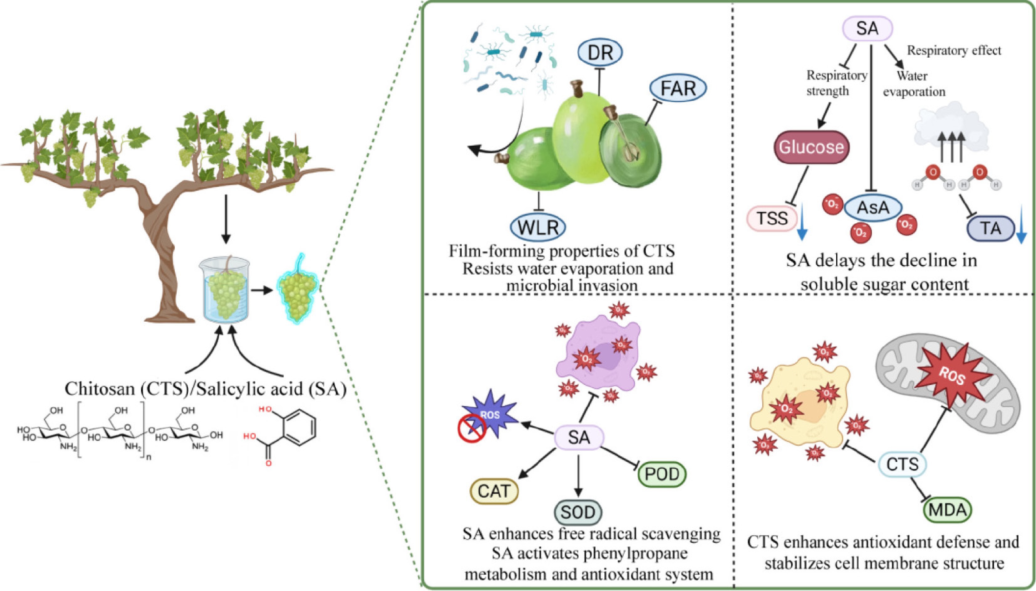 Effects of postharvest coating with chitosan and salicylic acid on grape storage quality. CTS (chitosan); SA (salicylic acid); DR (decay rate); WLR (weight loss rate); FAR (fruit abscission rate); TSS (total soluble solids); TA (titratable acidity); AsA (ascorbic acid); CAT (catalase); SOD (superoxide dismutase); POD (peroxidase); MDA (malondialdehyde); ROS (reactive oxygen species). The figure was created on BioRender (www.biorender.com).