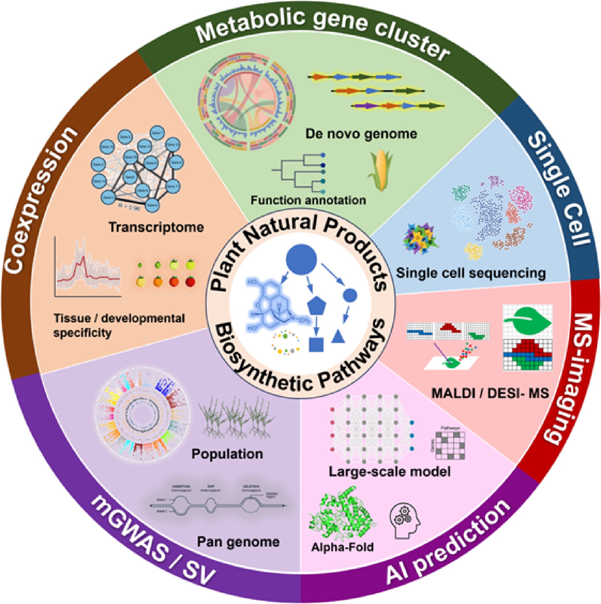 Along with the development of high-throughput technologies, biologists can comprehensively measure genome constitution, gene expression, and metabolism: Next Generation Sequencing (NGS) technologies have pushed the development of plant genomics, enabling comprehensive investigation of genome composition, structure, functional elements, and evolutionary dynamics. Transcriptomics, which also leverages NGS, examines global gene expression patterns by quantifying RNA abundance per gene. Metabolomics profiles the complete set of metabolites using chromatographic techniques coupled with mass spectrometry, and nuclear magnetic resonance (NMR) spectroscopy. These methods collectively regarded as 'omics' generate vast amounts of data requiring bioinformatic analysis. Along with the development of multi-omics techniques, reverse genetics started to flourish in the discovery of pathways for the biosynthesis of plant natural products in recent years. De novo genome assembly, followed by structural and functional annotation identifies genes and their functions based on homology; biosynthetic gene clusters (BGC) are regularly found by taking advantage of the similarity of structural arrangements of genes in common biosynthetic pathways; co-expression of function elucidated genes from transcriptome studies provides convincing inferences of candidate catalytic genes; metabolome measurement, and second-generation sequencing of plant populations enable metabolome genome-wide association studies (mGWAS) to identify variation in Single Nucleotide polymorphisms (SNPs) related to secondary metabolism; comparative genomics and analysis of the pan-genome of a taxon are useful in detecting large structure variations for related metabolic phenotypes; comparison of omics datasets also dictate the evolutionary trajectory of plant natural product biosynthesis pathways[4,5].