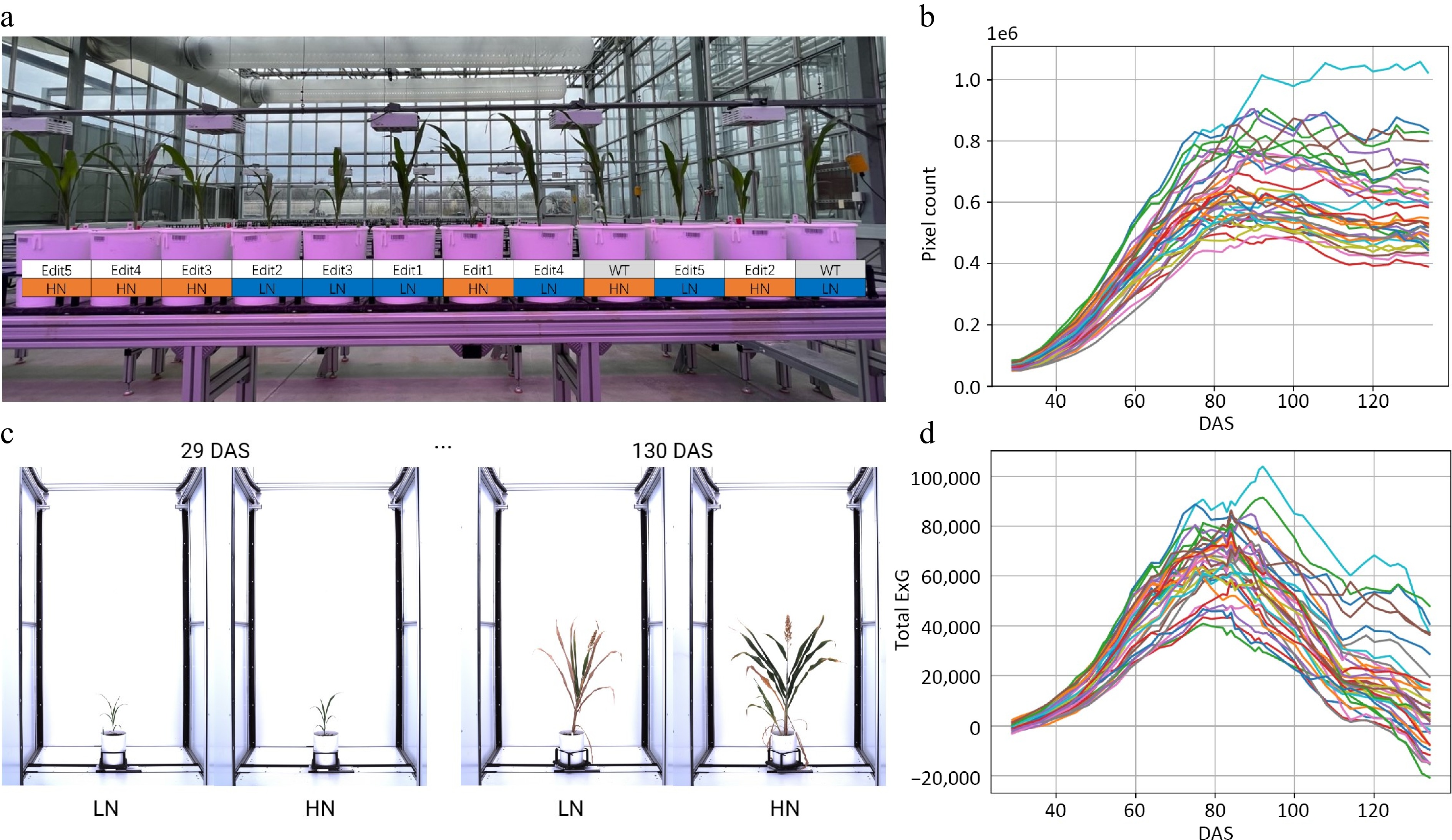Characterizing sorghum CRISPR mutants for N responses using a high-throughput phenotyping procedure. (a) The greenhouse experimental design for CRISPR mutants under high N (15 mM) and low N (3 mM) conditions. (b) Time-series automatic image acquisition from the first day of phenotyping (29 DAS) to the last day of phenotyping (130 DAS). The examples are Tx430 WT. The extracted phenotypes. (c) Pixel count. (d) Total ExG index value for each individual during the phenotyping period.