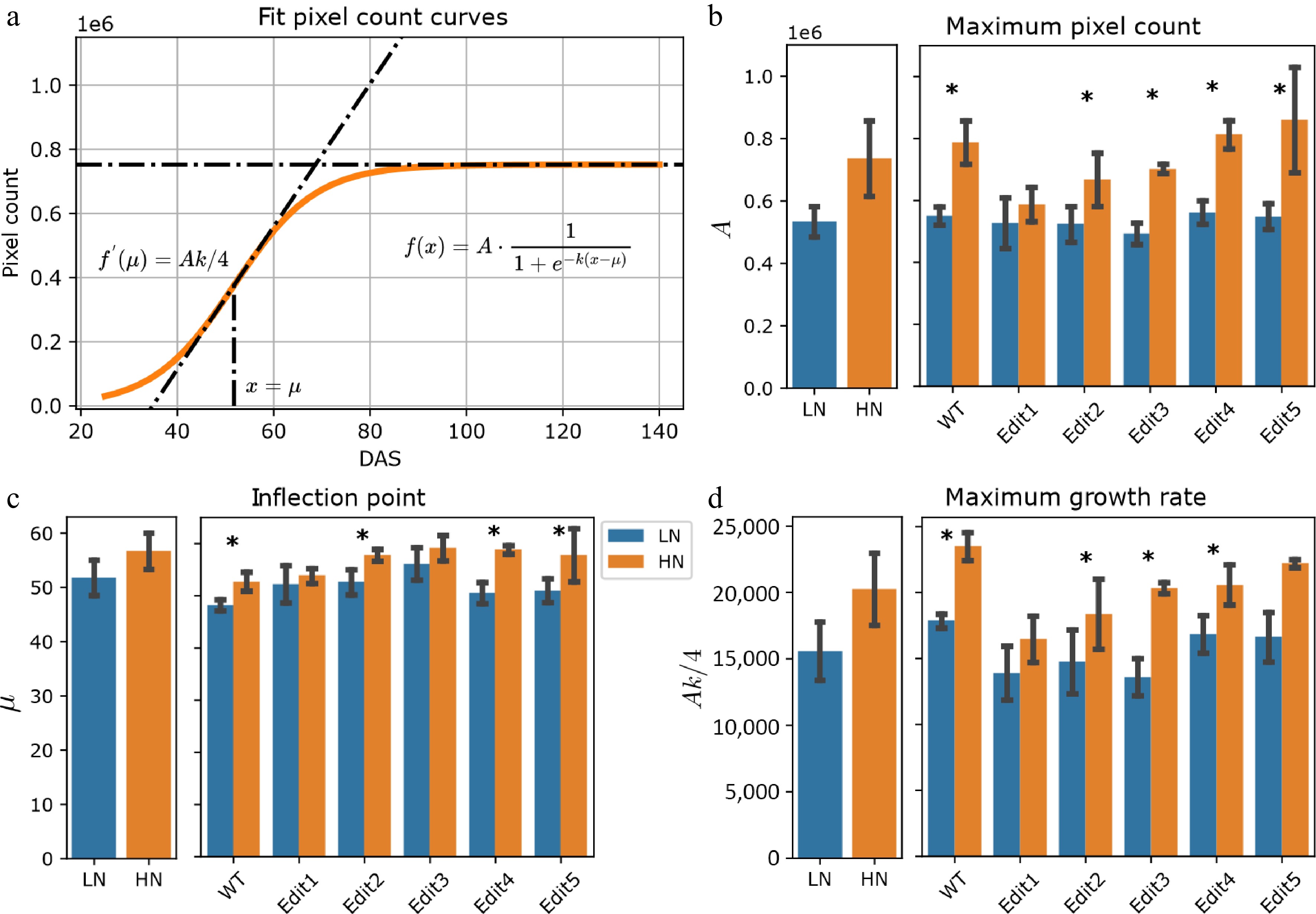 The parameter µ, representing the DAS when the fastest pixel count growth rate was achieved, may indicate the transition from vegetative growth, such as leaves and stalks, visually apparent from the images, to reproductive growth. The results suggested that overall, the plants achieved the fastest growth rate under high N than low N conditions (F-test, p-value < 0.001, Fig. 2c & Supplementary Table S3). Again, this pattern was not observed for Edit1 (F-test, p-value = 0.312, Supplementary Table S5). Consistently, the fastest growth rate, measured using Ak/4 (see Materials and Methods), indicated that there was an overall significantly faster rate (F-test, p-value < 0.050, Fig. 2d & Supplementary Table S5) when N was sufficient. Taken together, the data suggested that WT and Edit2-5 grew longer and faster, which was consistent with the hand-measured data that they accumulated more biomass under high N compared to low N conditions, while Edit1 appeared unresponsive to high N treatments.