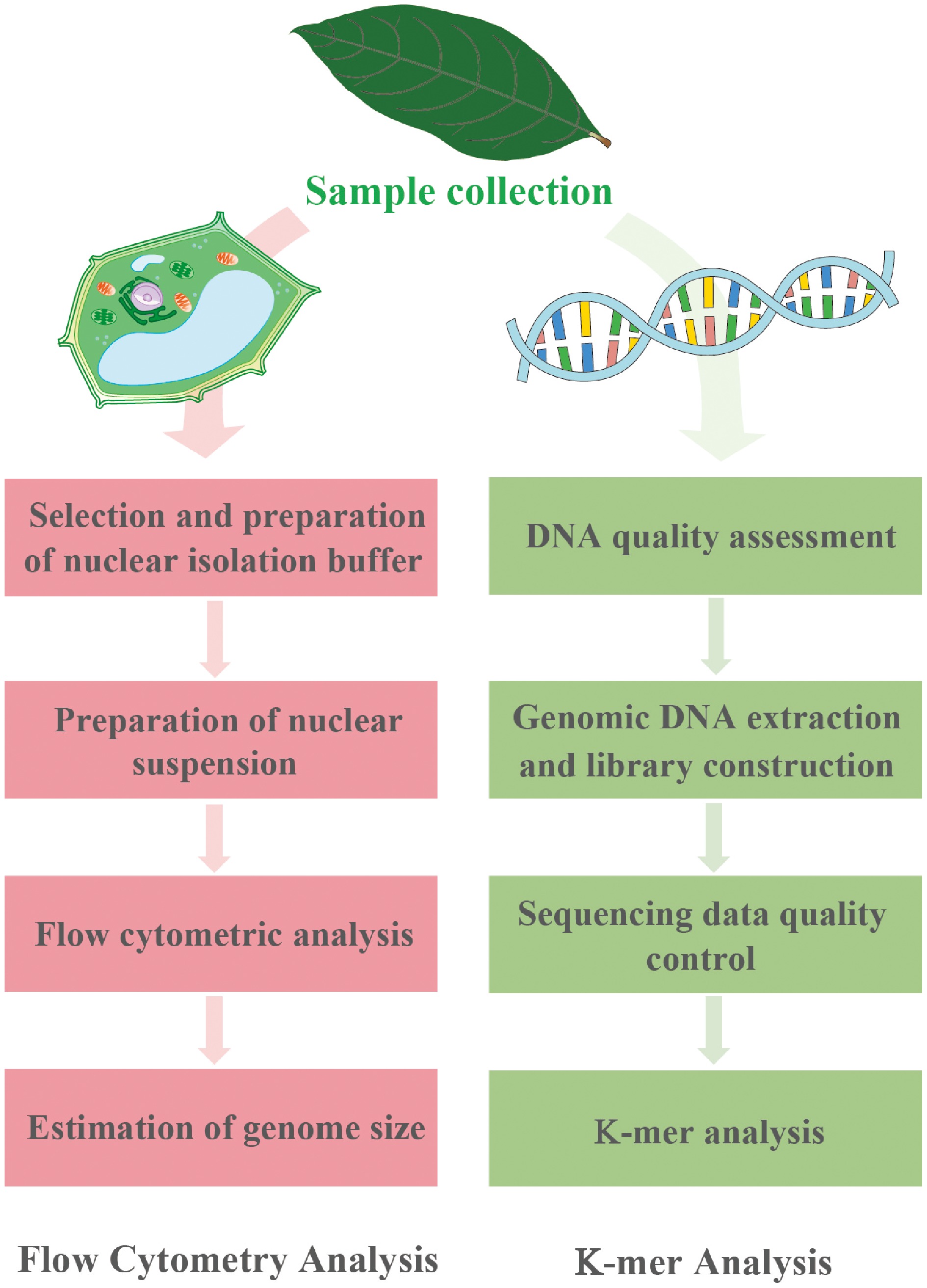 • Genome size, defined as the DNA content of a haploid genome in a species[1], represents a fundamental biological trait with profound evolutionary and ecological implications. The standard measurement units include picograms (pg) or megabase pairs (Mb), with a conversion factor of 1 pg ≈ 978 Mb[2]. Among land plants, genome size exhibits remarkable variability[3]. Differences in genome size are correlated with multiple adaptive traits in plants, including cell division rates in cellular processes[4], reproductive modes in mating systems[5], growth forms in morphology[6], ecological stoichiometry in biochemical processes[7], and diversification rates in speciation processes[8]. Ecologically, genome size exerts pleiotropic effects on cellular architecture and organismal life history strategies[9,10]. The C-value, defined as the amount of DNA contained within a haploid nucleus (i.e., the unreplicated gametic genome size), has been observed to correlate positively with cellular traits such as increased cell volume and prolonged cell cycle duration. Conversely, it exhibits an inverse relationship with metabolic rates, potentially imposing evolutionary constraints on ecological niche breadth[11,12]. Notably, the species-specific stability of the C-values facilitates phylogenetic reconstruction and taxonomic identification, highlighting their taxonomic utility[13], whereas in genomic applications, precise determination of the C-value provides critical parameters for estimating the sequencing depth, optimizing costs, and assembling repetitive sequences[14]. Among its emerging roles, genome size transitions serve as an intrinsic genomic property that can act as a dynamic biomarker for evolutionary trajectories in ecological dynamics, their precise quantification has been a critical research priority[15,16]. Undoubtedly, genome size has important ecological and evolutionary implications[3,17,18]; thus, estimating genome size is vital for understanding its associated functional significance. Consequently, accurate estimation of genome size is becoming increasingly important..