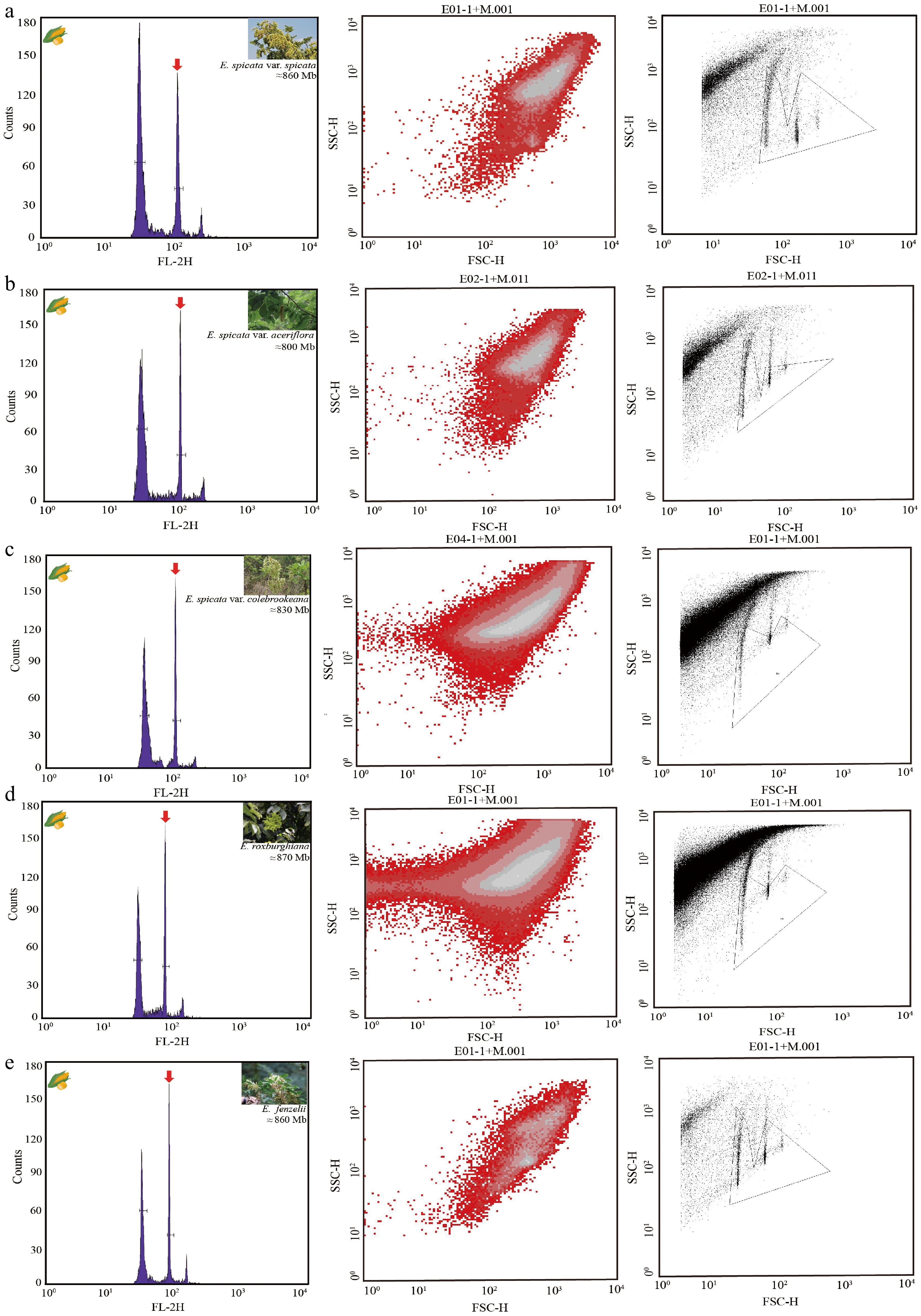 FCM histograms and scatter plots of estimated nuclear DNA content in five Engelhardia species. (a)–(e) represent different species or varieties of Engelhardia, showing the FCM results from the same sample. Left: fluorescence intensity histogram (FL-2H) indicating the relative nuclear DNA content, with the major G1 peaks marked by red arrows. Middle: dot plots of forward scatter (FSC-H) versus side scatter (SSC-H), showing cell/nuclei size and granularity. Right: corresponding gated regions for nuclei selection in FSC-SSC space. (a) E. spicata var. spicata; estimated genome size ≈ 860 Mb. (b) E. spicata var. aceriflora; estimated genome size ≈ 800 Mb. (c) E. spicata var. colebrookeana; estimated genome size ≈ 830 Mb. (d) E. roxburghiana; estimated genome size ≈ 870 Mb. (e) E. fenzelii; estimated genome size ≈ 860 Mb. All measurements were performed using PI staining with an appropriate internal standard. Histograms show clearly separated peaks for the sample and standard, allowing a reliable estimation of genome size.