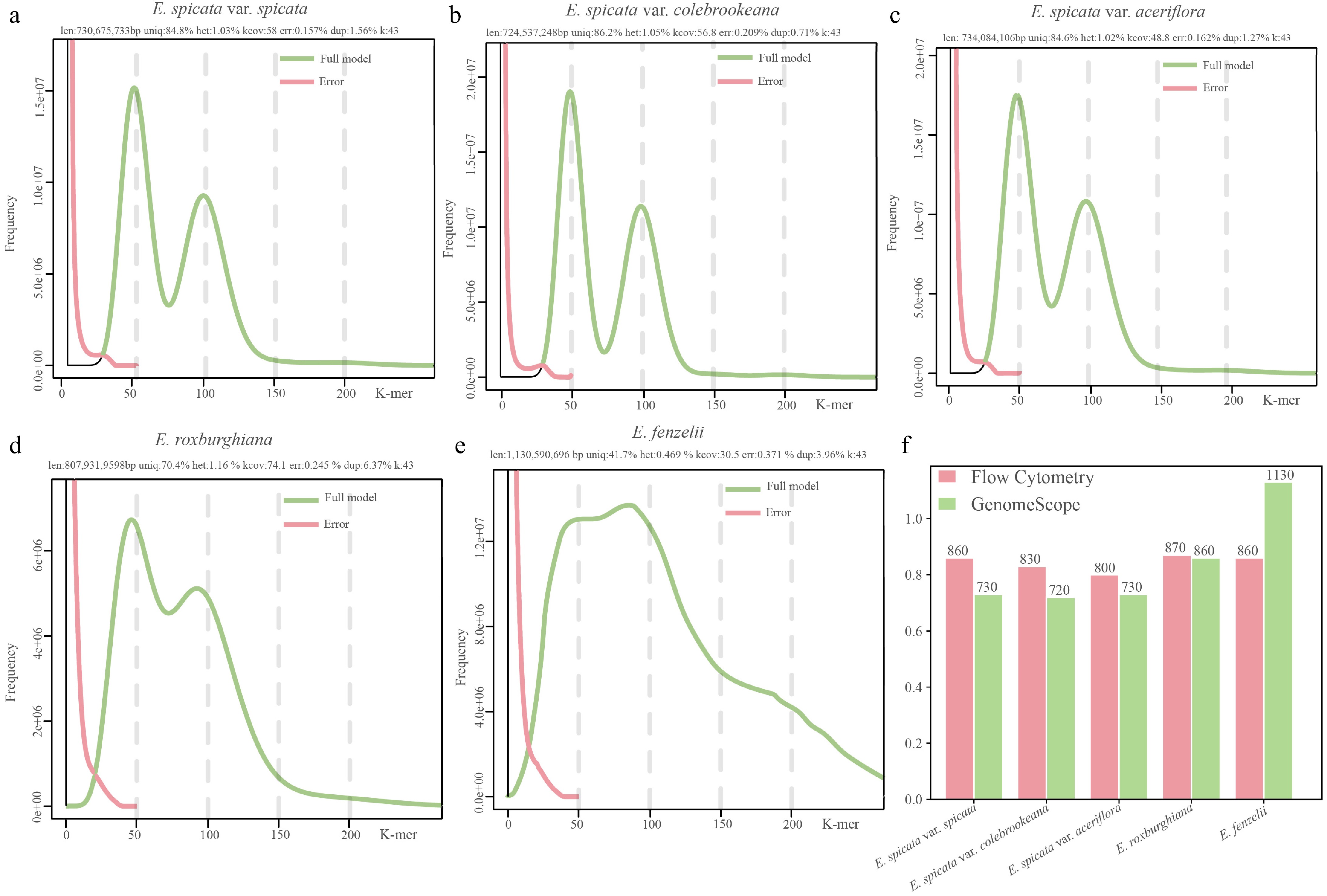 In this study, we focused on Engelhardia, a representative genus within the Juglandaceae family, to conduct a comparative analysis of genome size estimates across five species: Engelhardia spicata var. spicata, Engelhardia spicata var. colebrookeana, Engelhardia spicata var. aceriflora, Engelhardia roxburghiana, and Engelhardia fenzelii. This genus is widely distributed in tropical and subtropical regions of East Asia, and fossil evidence suggests a close association with tropical environments in the Indochina Peninsula during the early Eocene. Subsequent climatic cooling during the Miocene, along with the onset of the East Asian summer monsoon, is believed to have driven the diversification of Engelhardia into subtropical regions, highlighting its ecological and evolutionary significance[3436].