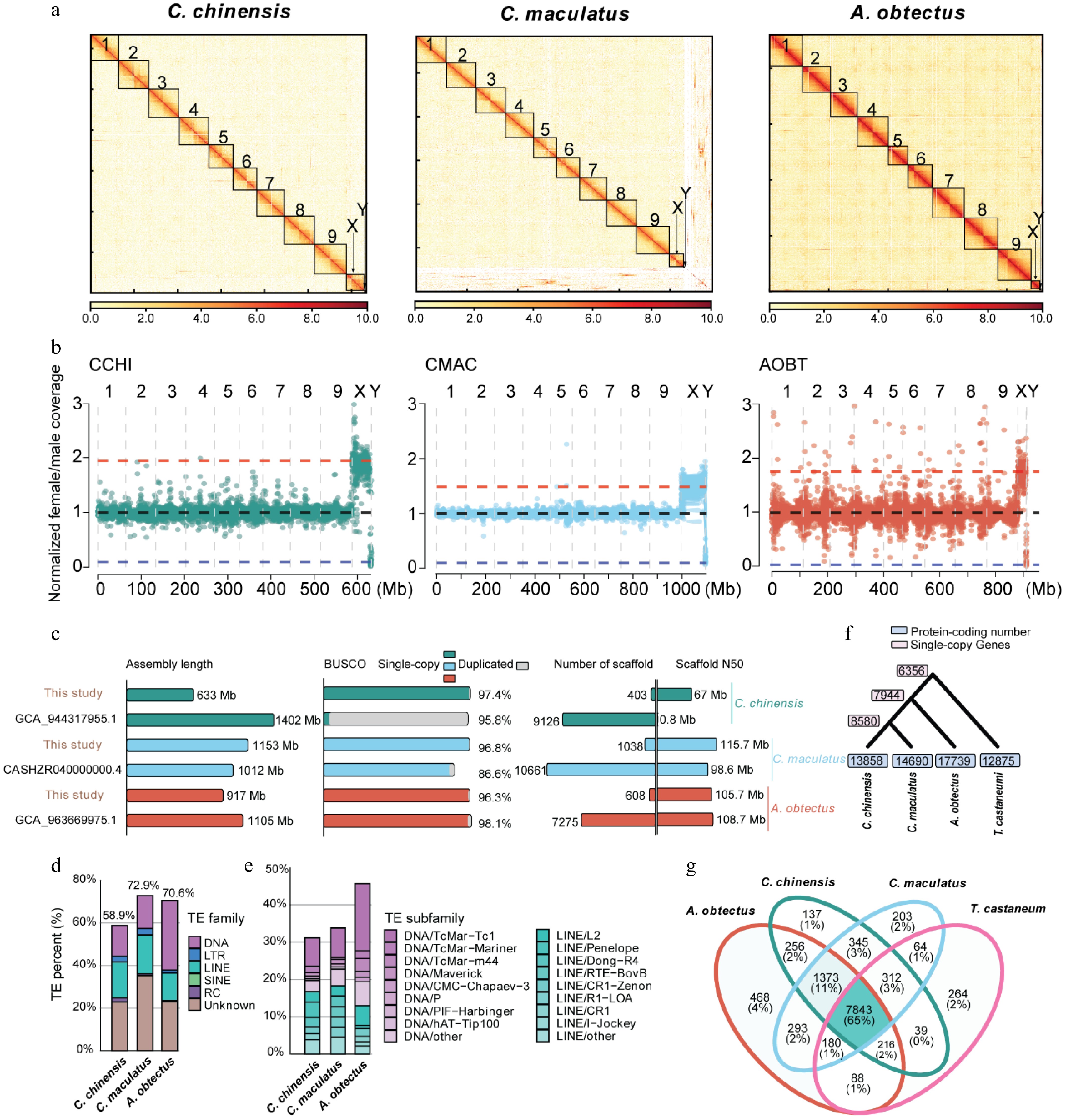 Genome assembly and annotation of C. chinensis, C. maculatus, and A. obtectus. (a) Hi-C contact maps of the C. chinensis, C. maculatus, and A. obtectus genome assembly. Black boxes denote putative chromosomes. White indicates the weakest scaffold interaction, while red indicates the strongest interaction. (b) Normalized female/male whole-genome sequencing coverage over the three seed beetle species's genome assemblies. Each point represents a 100-kb window. Blue, black, and red horizontal lines indicate the expected coverage over Y-linked, autosomal, and X-linked scaffolds, respectively. (c) Comparison of genome assembly parameters with previously published genomes for the three seed beetle species. (d) Repeat landscape of the three seed beetle species' genomes. (e) Landscape of the subfamily of DNA transposons and long interspersed nuclear element (LINE) transposons of the three seed beetle species' genomes. (f) Phylogenetic trees and gene number of three seed beetle species and the model species T. castaneum. (g) Comparative analysis of orthologous families from the three seed beetle species and the model species T. castaneum.