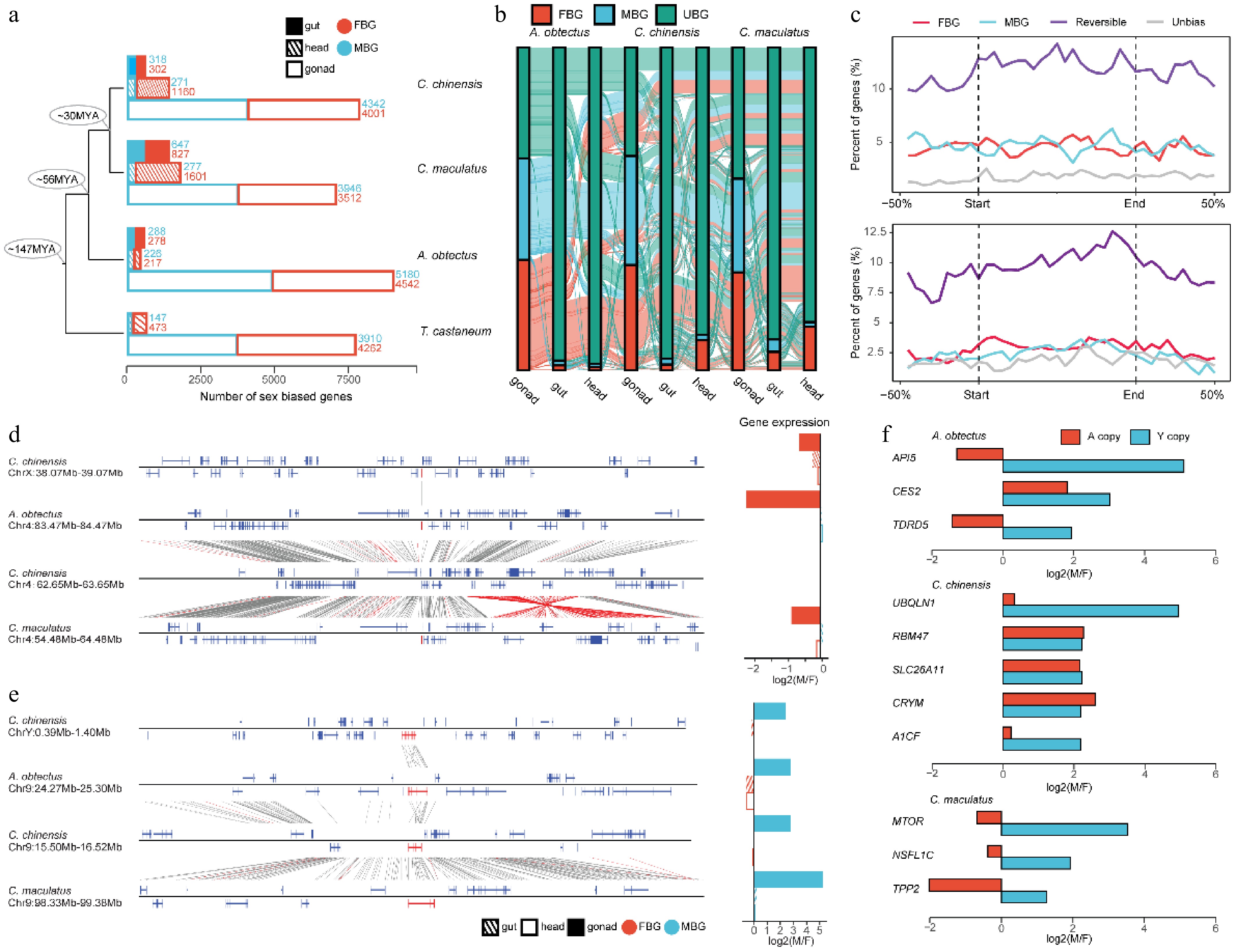 The evolution of sex-biased genes in Bruchinae. (a) Comparison of the number of sex-biased genes between different species and tissues. We identified male-bias genes (MBG) and female-bias genes (FBG) in male and female samples from different tissues. The specific number of genes is indicated by numbers. (b) The Sankey diagram showing dynamic variation in sex-biased genes across different tissues and species. UBG, unbiased gene. (c) Distribution of sex-biased gene density between A. obtectus and C. chinensis (top) and between A. obtectus and C. maculatus (bottom) along sequence inversions. 'Reversible' represents the orthologs with different sex-biased expression patterns in different species. (d) Nonreplicating translocation event of gene. (e) Replication translocation event of genes. The genes that undergo translocation are marked in red on the collinearity chart, and the corresponding sex-biased expression patterns in different tissues are shown in the bar plot. (f) The expression of genes with strong sex bias on the Y chromosome and their orthologous genes on the autosomes. Expression of Y-linked genes was calculated using testis and ovary tissues.