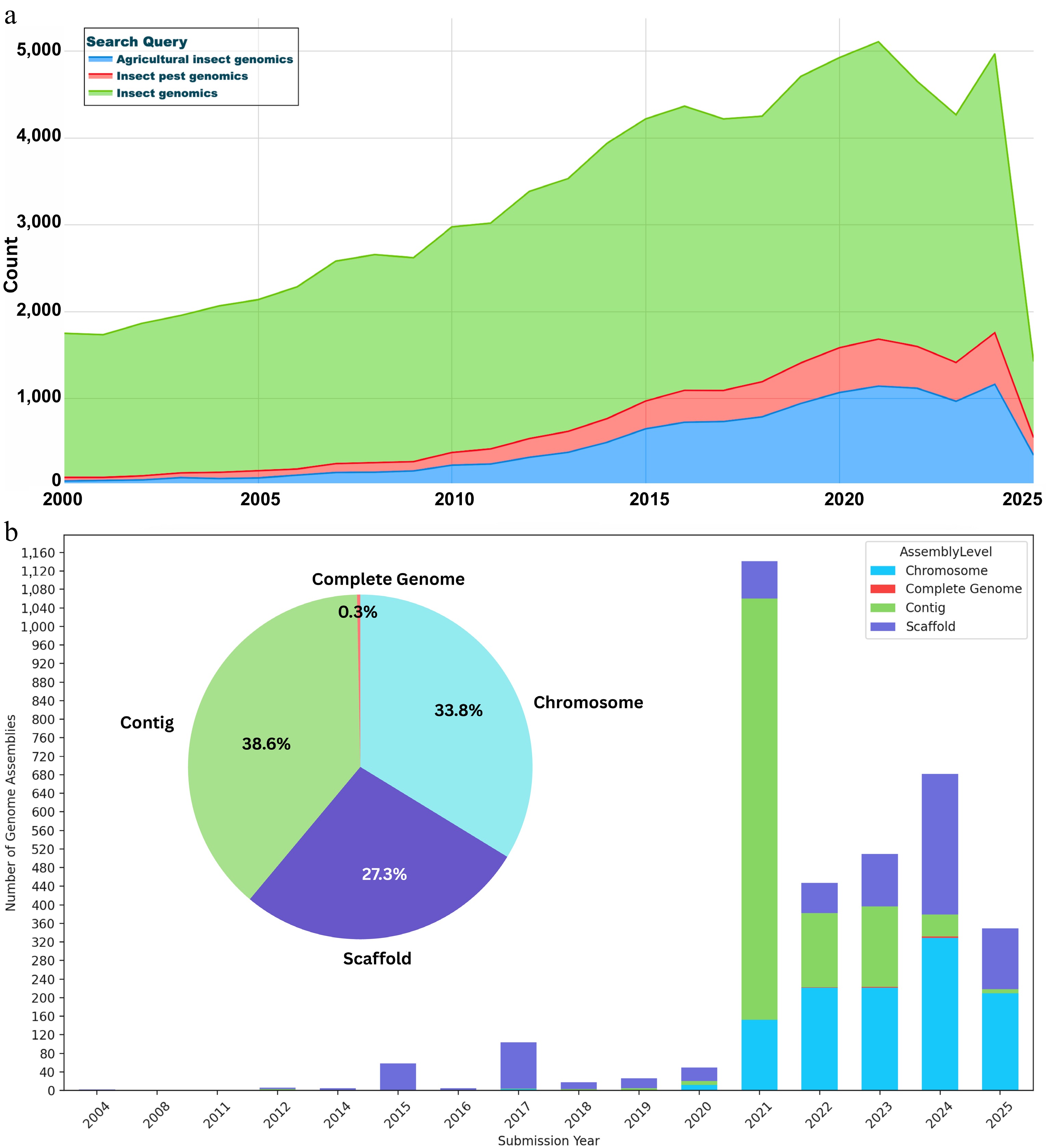 • Traditional pest management strategies, specifically reliance on chemical pesticides have enormously led to the emergence of resistance in insect pests, environmental degradation, and nontarget effects on food safety[1]. Agricultural insect pests are highly adept at adapting to both natural and human-induced stressors, consistently overcoming population bottlenecks and developing resistance to intensive management strategies. Agricultural insects refer to both pests and beneficial insect species that have a direct or indirect impact on agricultural systems/space. The overuse and exploitation of insecticides have exacerbated adaptive resistance mechanisms in pest populations, rendering many conventional control strategies less effective[2]. This has resulted in a significant need for environmentally friendly, sustainable, and tailored approaches that can minimize the reliance on chemical-based interventions. In a wake of recent scientific breakthroughs, genomics has grown as a revolutionary field, providing unprecedented insights into the biology, evolution, and adaptation of insect pests. Leveraging whole-genome sequencing and transcriptomic analyses, researchers can decode the genetic blueprint of insect pests, identifying the genes and pathways responsible for key adaptive traits, including insecticide resistance, immune response, reproduction, and host plant specialization[3]. Briefly, genomics is a field of science that dwells on the study of an organism's entire set of genetic material, known as the genome. Genomics, as a key component of the omics field, has driven a paradigm shift in insect pest studies across multiple levels, including molecular, comparative, population, structural, epigenetic, and translational landscapes. The ability to perform genome-scale analyses enables researchers to address critical questions that were previously intractable using small numbers of neutral genetic markers[4]. Through the 5,000-insect genome project, several complete genomes have been accomplished. Through searches on PubMed we found over 78,910 related publications (Fig. 1a). Over the years, several insect genomes have been generated, ranging from contig-level to complete genomes, with contig- and chromosome-level assemblies dominanting (Fig. 1b). These advancements in insect pest genomics have enabled the tracking of resistance-linked alleles, the prediction of outbreaks, and a deeper understanding of evolutionary dynamics in response to environmental fluctuations.
