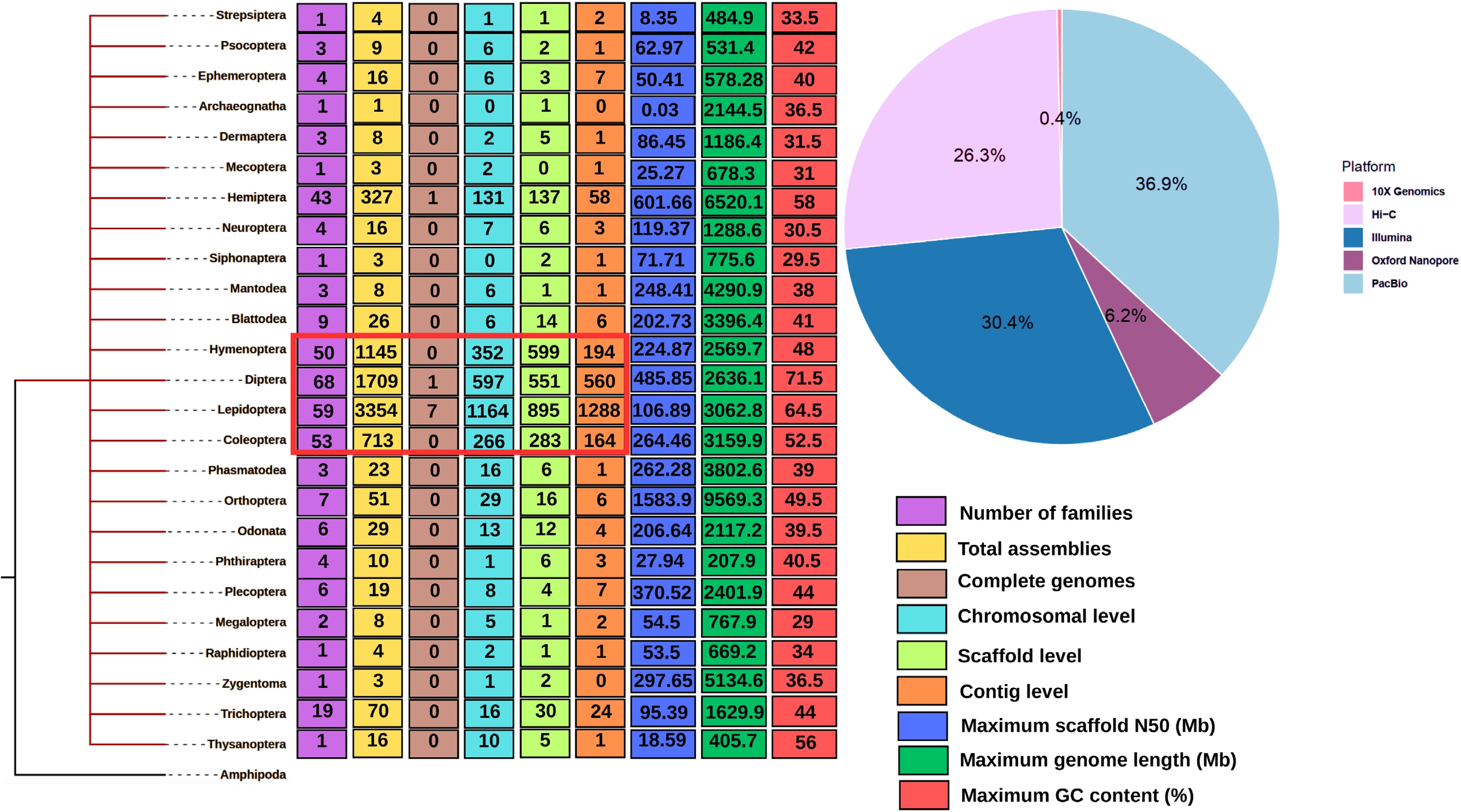Phylogenetic tree representing 25 insect orders for which nuclear genome assemblies are publicly available in the NCBI database. The tree is rooted with Amphipoda, which, while not an insect order, serves as an appropriate outgroup for comparative purposes. Each order is annotated with the number of insect families that have at least one genome sequenced, as well as proportions reflecting the genome assembly's level such as contig, scaffold, and chromosome-scale. Additional annotations include the maximum scaffold N50, contig N50, and GC content observed for each order. Insect orders with dominant representation at higher assembly levels are highlighted in red. The pie chart alongside the tree summarizes the relative distribution of major sequencing technologies such as Illumina, PacBio HiFi, Oxford Nanopore, 10X Genomics, and Hi-C used across these genome projects.