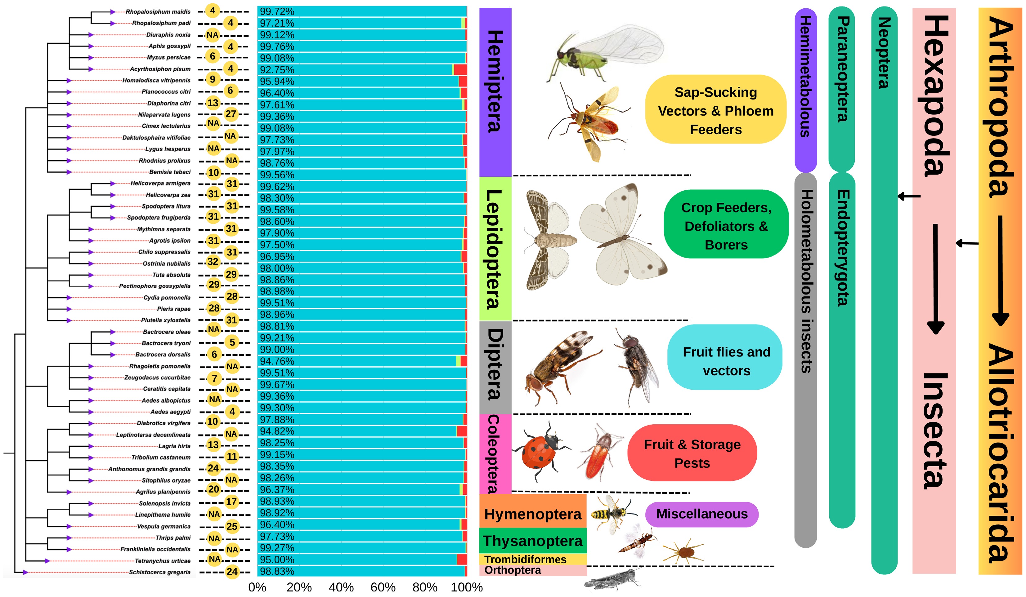 • Genome sequencing has revolutionized the study of agricultural insect pests by providing a comprehensive view of their genetic makeup. It serves as the foundation for understanding key biological traits, including adaptation to host plants, insecticide resistance, and reproductive strategies. Advances in sequencing technologies, particularly next-generation sequencing (NGS) platforms like Illumina, and third-generation sequencing (TGS) methods such as PacBio and Oxford Nanopore, have facilitated the generation of high-quality reference genomes for numerous insect pest species[5]. Currently, genome assembly is a critical step following sequencing, involving the reconstruction of raw sequence reads into contiguous sequences that represent the insect genome. Genome assembly primarily employs two approaches: de novo assembly, which reconstructs genomes without relying on a reference, and reference-guided assembly, which leverages the genome of a closely related species as a template[6]. At present, several tools used for nuclear genome assembly have been developed with similar algorithms that involve aligning sequence fragments against one another, then identifying and merging overlapping sections[7]. Over 39 TGS-related tools for genome assembly are publicly available[8]. Other methods are haplotype-based genome assembly methods, which are known to be computationally intensive and difficult[9]. Short-read sequencing technologies like Illumina produce high-accuracy reads but often result in fragmented assemblies due to difficulties in resolving repetitive regions. Conversely, long-read sequencing technologies such as PacBio and Nanopore generate longer sequence reads that improve genomes' contiguity and structural resolution, particularly in highly repetitive insect genomes. Leveraging on these long reads, the near-complete assemblies of some chromosomes are now possible, also known as telomere-to-telomere (T2T) assembly in insects such as Oenanthe javanica (Apiales: Apiaceae) and Bombyx mori (Lepidoptera: Bombycidae)[1012] among the few T2T insect assemblies that are publicly available. Hybrid approaches, which combine short- and long-read sequencing, have been widely used to generate high-quality assemblies[13], as seen in the genome projects of Helicoverpa armigera (Lepidoptera: Noctuidae)[14] among others. As of 2025, over 7,400 insect genome assemblies have been deposited in public databases, including more than 2,647 chromosome-level, 2,500 scaffold-level, and 2,300 contig-level assemblies, according to the National Center for Biotechnology Information (NCBI). This rapid expansion has been fueled by the increasing use of long-read sequencing technologies such as PacBio; Oxford Nanopore, which produce contiguous read sequences that are typically ≥ 10 kb in length; and high-throughput chromatin conformation capture (Hi-C) scaffolding, particularly since 2015, which have enabled the generation of highly contiguous and few complete genome assemblies (Fig. 2). However, despite these technological advances, taxonomic representation remains uneven, with genomic resources disproportionately concentrated in a few major insect orders, most notably Diptera, Hymenoptera, Hemiptera, and Lepidoptera, while many ecologically and economically significant groups remain under-represented (Fig. 2).