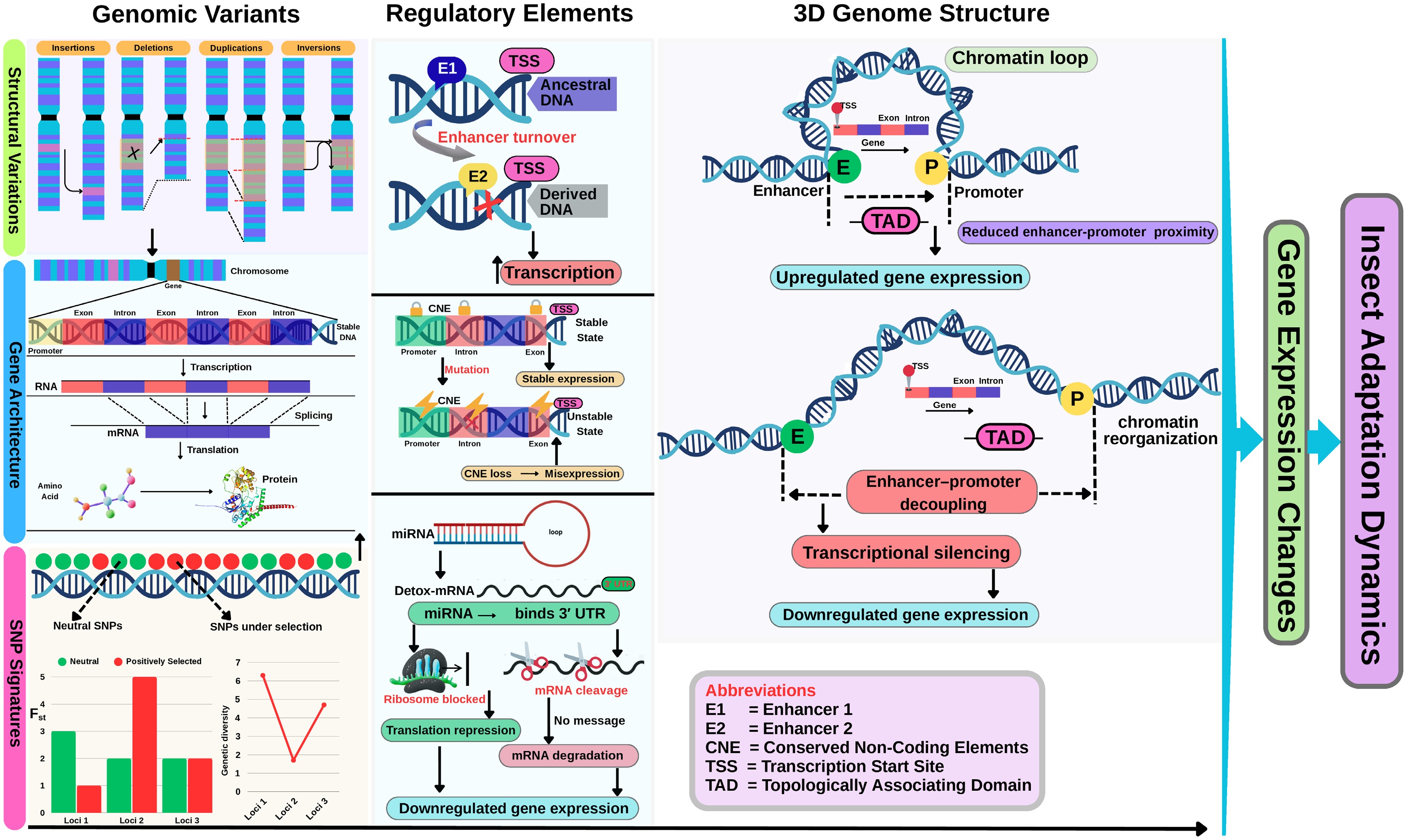 Important dimensions driving genomic divergence and gene regulation in insects. This figure integrates three major layers. First, genomic variants such as structural variants (insertions, deletions, duplications, inversions) and SNPs can reshape genes' architecture by altering exon–intron structures, splicing patterns, and transcriptional activity. Second, regulatory elements, including enhancers, conserved noncoding elements (CNEs), and microRNAs (miRNAs), modulate gene expression through multiple mechanisms; for instance, enhancer gain/loss affects transcription initiation, CNE mutations may lead to misexpression, and miRNAs regulate gene expression post-transcriptionally by repressing translation or mRNA degradation. Third, the 3D chromatin architecture shows how the genome folds into topologically associating domains (TADs), bringing enhancers and promoters into physical proximity to promote transcription. Disruption of these 3D structures can impair regulatory interactions and lead to altered expression. Collectively, these layers illustrate how genomic, regulatory, and structural mechanisms converge to drive adaptive and evolutionary responses in insect genomes, which directly influence their adaptation dynamics.