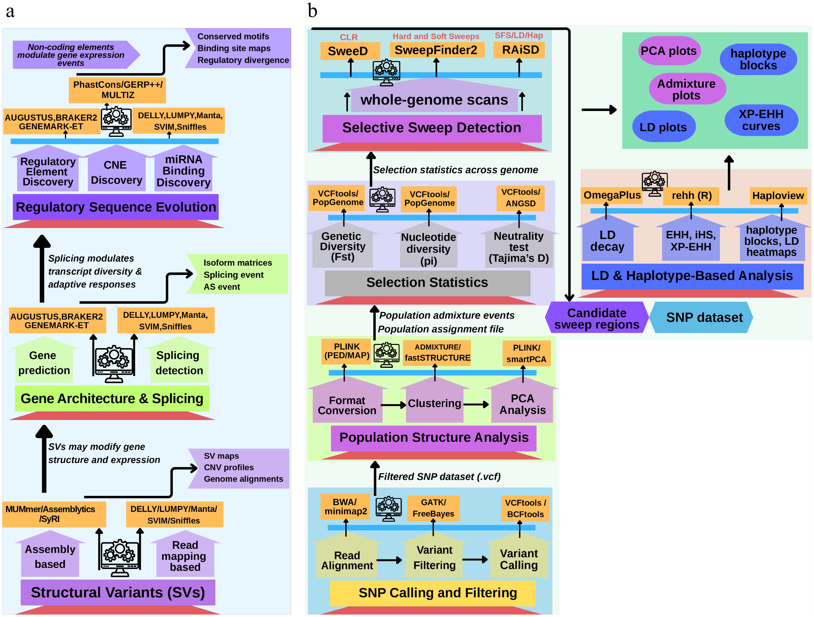 Multi-scale genomic tools for detecting adaptive evolution in insect pests. This schematic illustrates a tiered framework highlighting the major genomic layers contributing to insect pests' adaptation, along with the corresponding analytical tools and biological outputs at each level. Starting with Panel (a), Tier 1 showcases how structural variants (SVs), detected using tools such as DELLY, Manta, Assemblytics, and MUMmer, can reshape genomes' architecture and influence gene expression, yielding structural variant maps and genome alignments. Tier 2 focuses on alternative splicing and exon–intron variation, where tools like rMATS, SUPPA2, MAJIQ, and IsoSeq uncover isoforms' diversity and splicing event profiles. Tier 3 concerns regulatory sequence evolution, including enhancer turnover, conserved noncoding elements (CNEs), and miRNA binding changes, analyzed with PhastCons, GERP, MEME, FIMO, miRanda, and TargetScan to reveal transcriptional rewiring and binding site alterations. Panel (b) focuses on the detection of adaptive evolution through single nucleotide polymorphisms (SNPs), using pipelines such as GATK, PopGenome, ANGSD, RAiSD, rehh, and ADMIXTURE, alongside various tools to infer selective sweeps, population divergence, and haplotype dynamics. Collectively, this integrative approach demonstrates how layered genomic methodologies uncover the complex mechanisms underlying pest evolution and resistance.