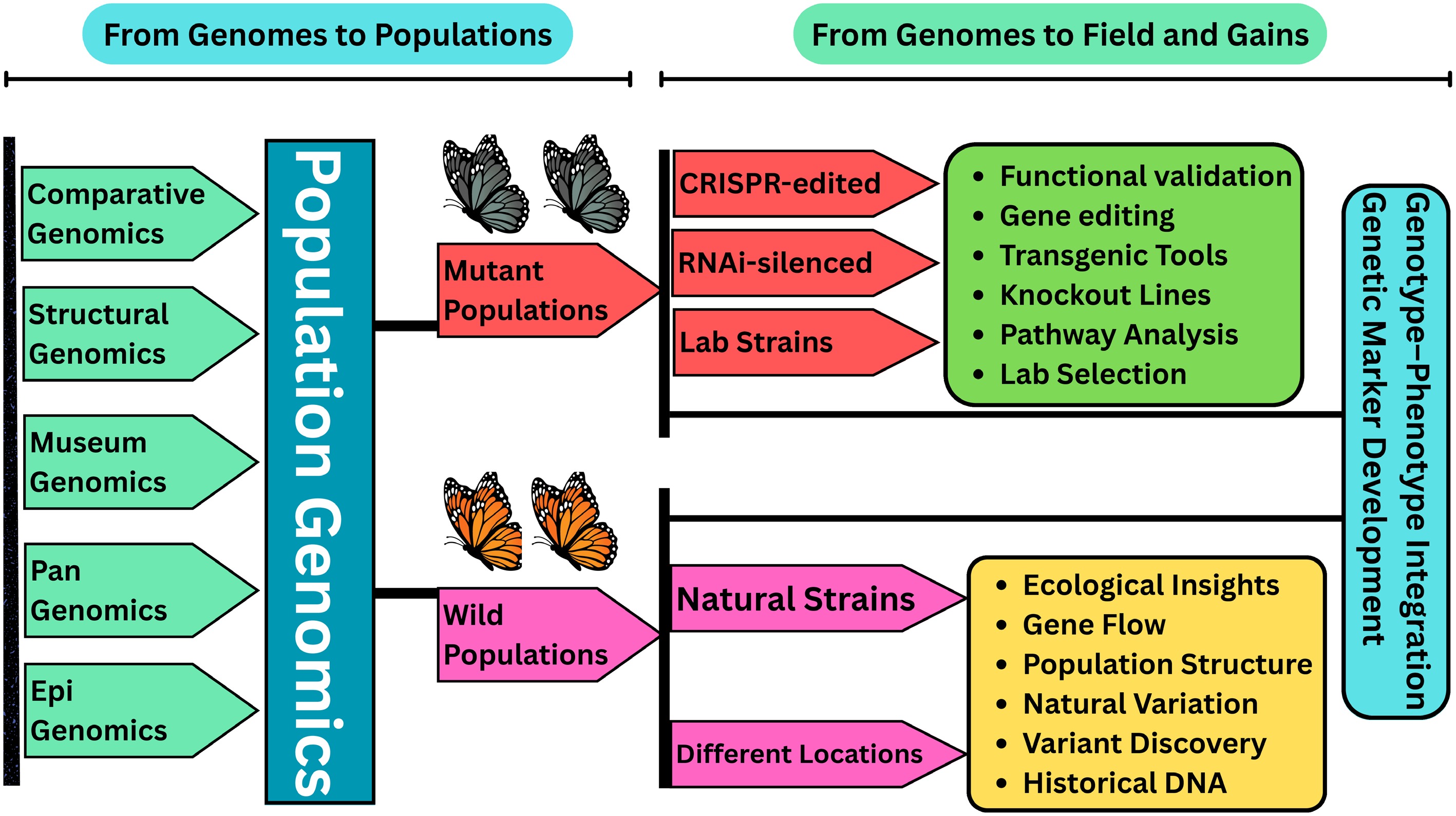 • This review explores the transformative potential of genomic technologies in insect pest research, emphasizing their impact on pest management strategies. We highlight key advancements, including genome sequencing (GS), which has enabled the generation of high-quality pest genome assemblies; comparative genomics, which reveals the evolutionary relationships and species-specific adaptations; and population genomics, which tracks genetic diversity and the spread of resistance alleles. Additionally, we examine emerging fields such as pangenomics, which investigates genetic variation within species; epigenomics, which elucidates the role of epigenetic mechanisms in pest adaptation; and structural genomics, which enhances our understanding of the protein structures that are critical for insecticide development. Furthermore, we discuss museum genomics, which leverages historical specimens to study long-term evolutionary and ecological changes; mitochondrial genomics, which has a role in evolutionary biology; and translational genomics, which bridges fundamental genomic discoveries with practical pest control applications. 'Genomics is here today, and it will be there tomorrow': this statement encapsulates the transformative and enduring impact of genomic research on evolutionary biology. These genomic studies will help in safeguarding increased productivity, hence contributing to Sustainable Development Goal 2 (SDG 2) of the United Nations (www.un.org/sustainabledevelopment/hunger) in achieving a world free from hunger and a better world. By integrating various genomic approaches, this review provides a perspective in a simplified format on how genomics is revolutionizing pest management in addressing critical agricultural challenges worldwide. While it is not feasible to comprehensively cover all insect taxa, this review highlights notable advances and emerging trends in insect genomics.
