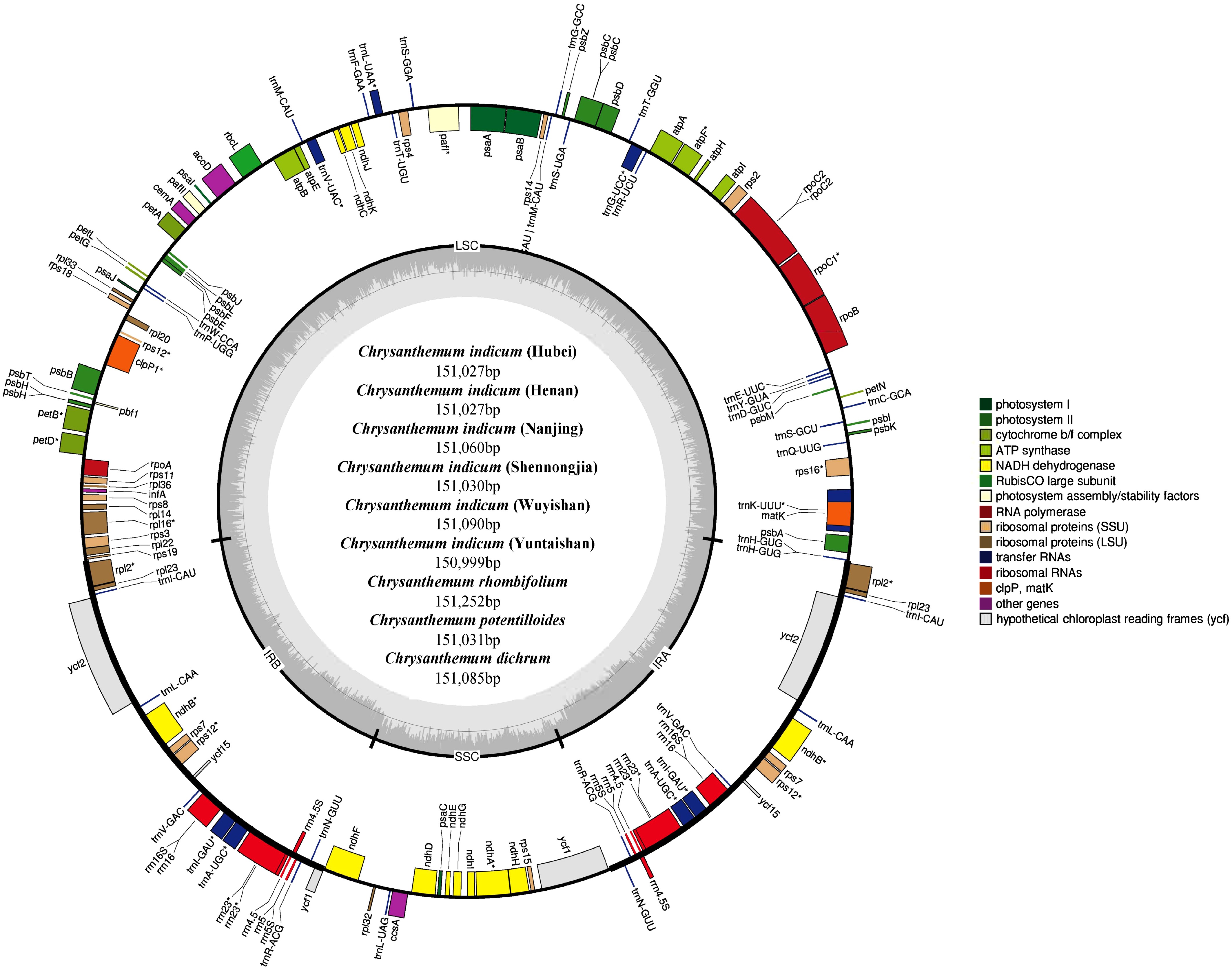 In this study, we successfully conducted de novo assembly of the complete chloroplast genomes for nine Chrysanthemum accessions, including C. dichrum, C. indicum (Henan), C. indicum (Hubei), C. indicum (Nanjing), C. indicum (Shennongjia), C. indicum (Wuyishan), C. indicum (Yuntaishan), C. potentilloides, and C. rhombifolium (Fig. 1). All genomes exhibited the typical quadripartite circular structure characteristic of most angiosperm chloroplasts, comprising a large single-copy (LSC) region, a small single-copy (SSC), and two inverted repeats (IRa and IRb). This conserved structural organization reflects a high degree of evolutionary conservation across the Asteraceae family.