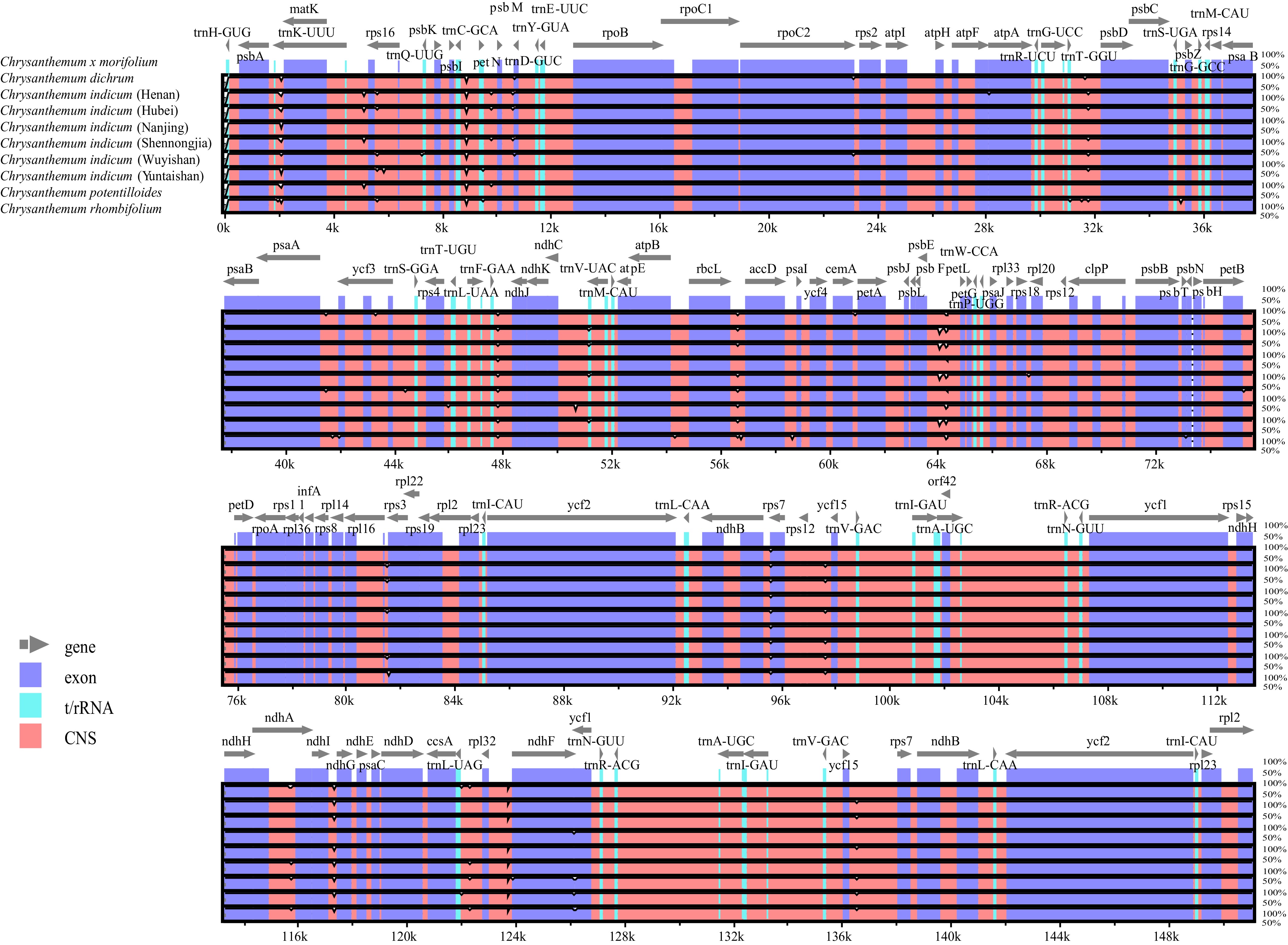 Comparison of nine Chrysanthemum chloroplast genomes using the mVISTA program. Exons are presented in purple, t/rRNA is presented in blue, conserved non-coding sequences (CNS) are presented in pink.