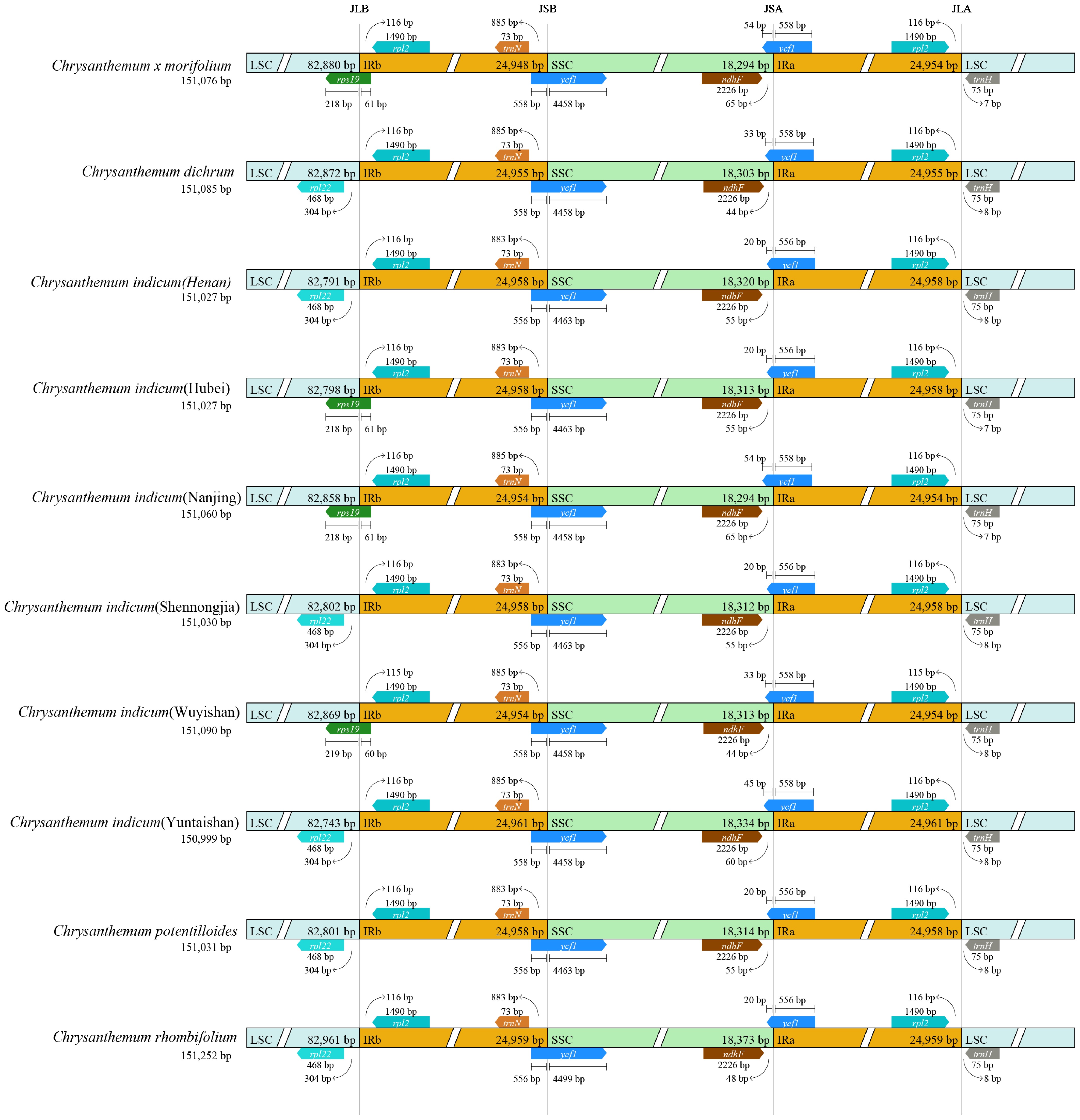 The boundaries for comparing the inverted repeat (IR) and single copy (SC) regions among the chloroplast genomes of nine Chrysanthemum populations.
