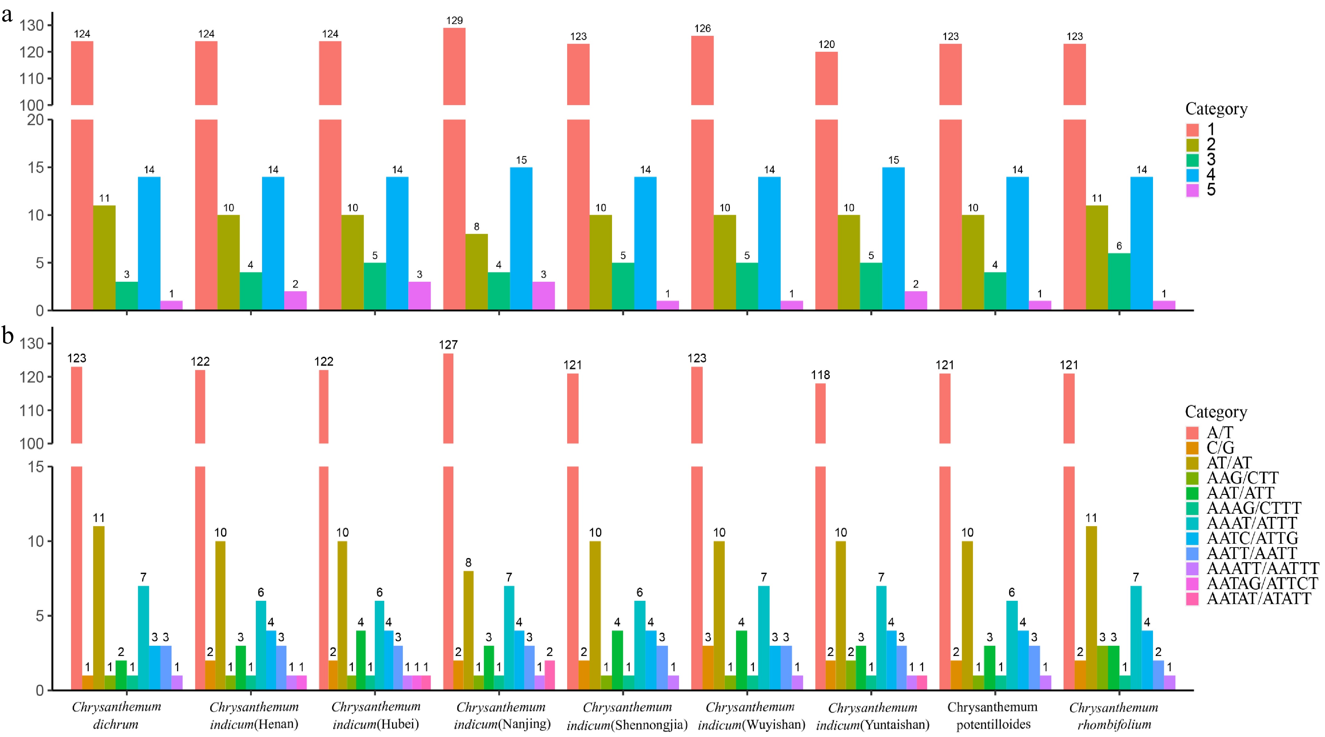 Simple sequence repeat (SSR) analysis. (a) Number of different SSR types detected in the chloroplast genomes of nine Chrysanthemum genera. (b) Frequency of identified SSR motifs in the chloroplast genomes of nine Chrysanthemum genera.