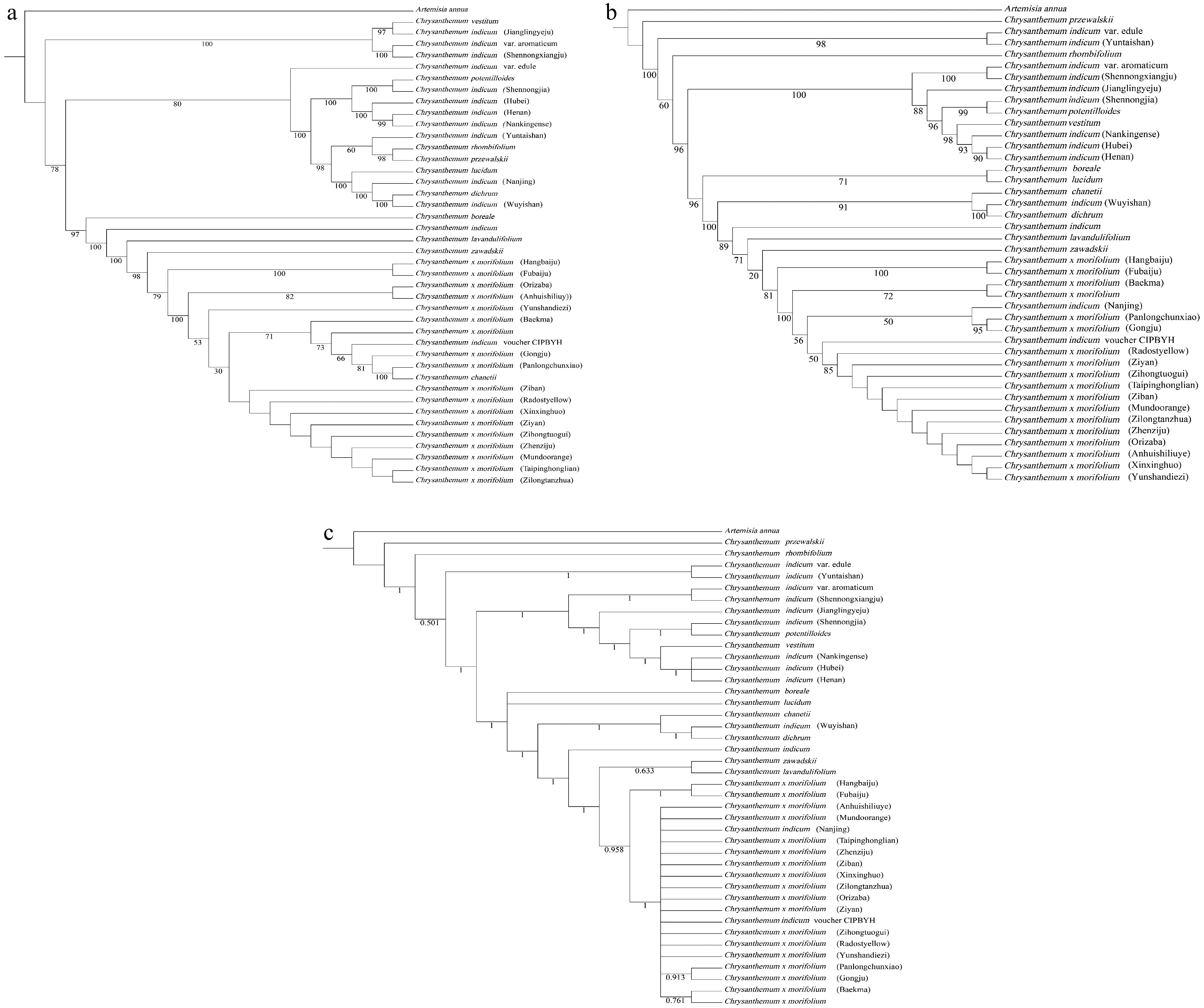 The phylogenetic tree was constructed using maximum likelihood (ML) and Bayesian inference (BI) methods, and was based on the complete chloroplast genome and chloroplast CDS of 41 Chrysanthemum species. Artemisia annua was used as the outgroup for the analysis. (a) Maximum likelihood phylogenetic tree of Chrysanthemum plants using complete chloroplast genomes. (b) Maximum likelihood phylogenetic tree of Chrysanthemum plants using chloroplast CDS. (c) Bayesian inference phylogenetic tree of Chrysanthemum plants using chloroplast CDS.