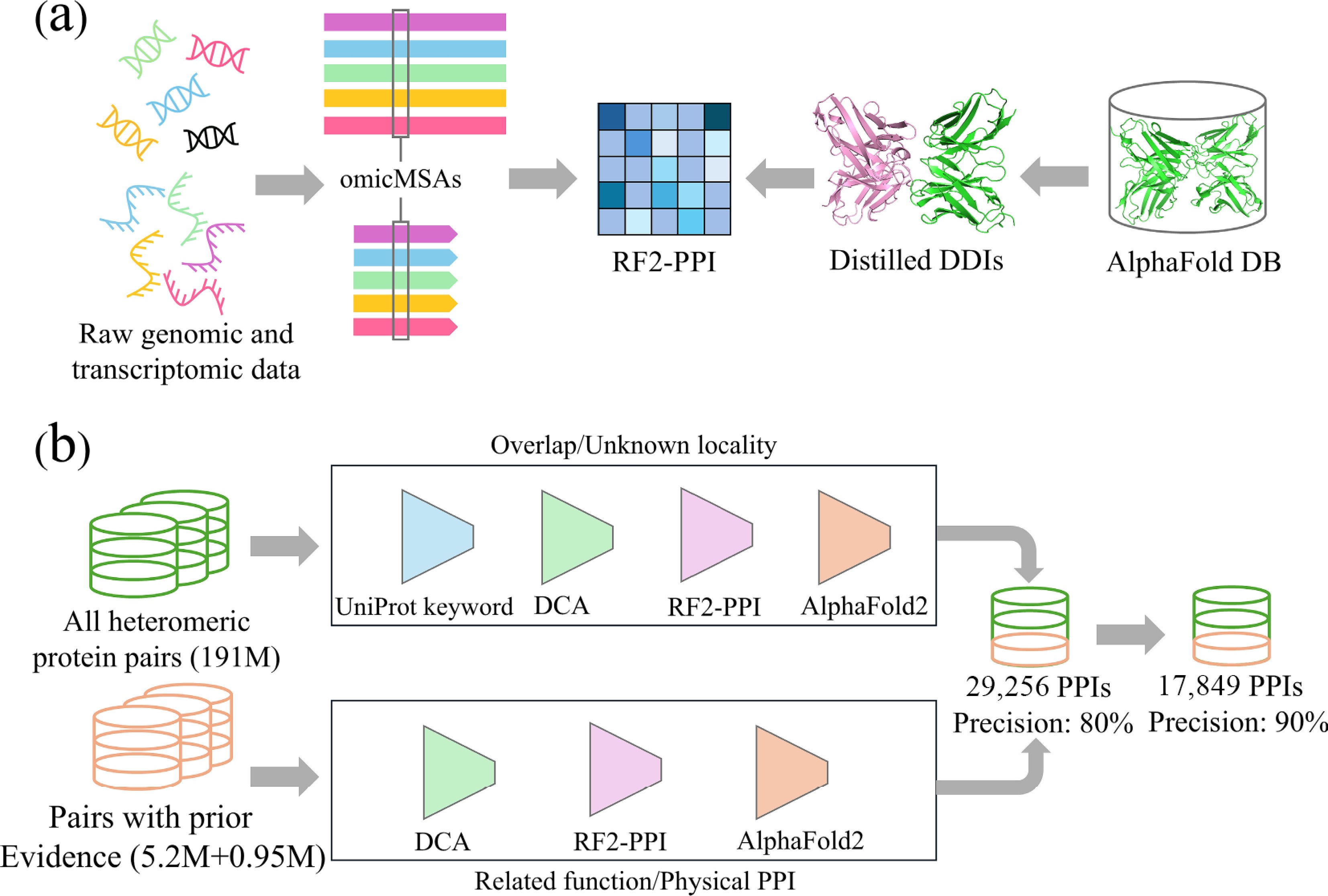 Large-scale human PPI prediction analysis diagram based on deep learning. (a) Integration of sequence and structure information to train RF2-PPI. Raw genomic and transcriptomic data from diverse eukaryotes are processed to construct omicMSAs. In parallel, high-confidence intra-chain domain-domain interactions are distilled from AlphaFold DB monomer models. These sequence-based omicMSAs and structure-derived distilled DDIs are jointly used to train RF2-PPI. (b) Schematic overview of the two complementary screening pipelines used to predict human PPIs. For the de novo search, all heteromeric protein pairs formed by screened proteins are restricted to proteins with overlapping or unknown subcellular localization. They are then sequentially filtered by UniProt keyword-based co-localization, DCA, RF2-PPI scoring, and AlphaFold2 complex modelling. For the evidence-guided search, protein pairs with prior evidence are evaluated by DCA, RF2-PPI and AlphaFold2 using more permissive score thresholds.