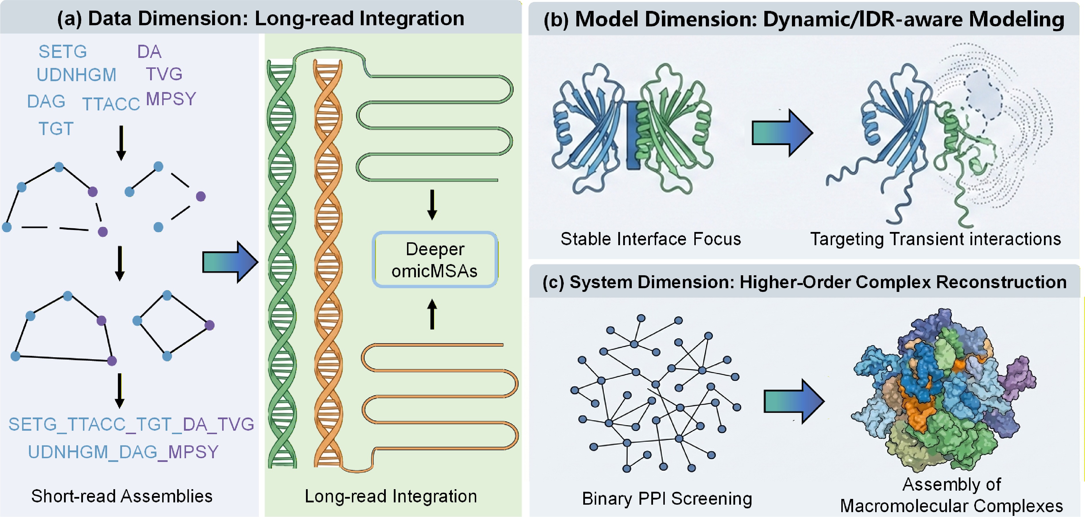 A roadmap for next-generation interactome prediction. The figure illustrates three dimensions for extending the current framework. (a) Data Dimension, moving from short-read assemblies to long-read integration to resolve difficult eukaryotic genomes and maximize evolutionary signal depth. (b) Model Dimension, evolving from stable interface focus to dynamic/IDR-aware modeling to capture transient signaling interactions and disordered regions often missed by rigid-body docking. (c) System Dimension, scaling up from binary PPI screening to higher-order complex reconstruction, integrating binary predictions into graph-based assembly of large molecular machines.