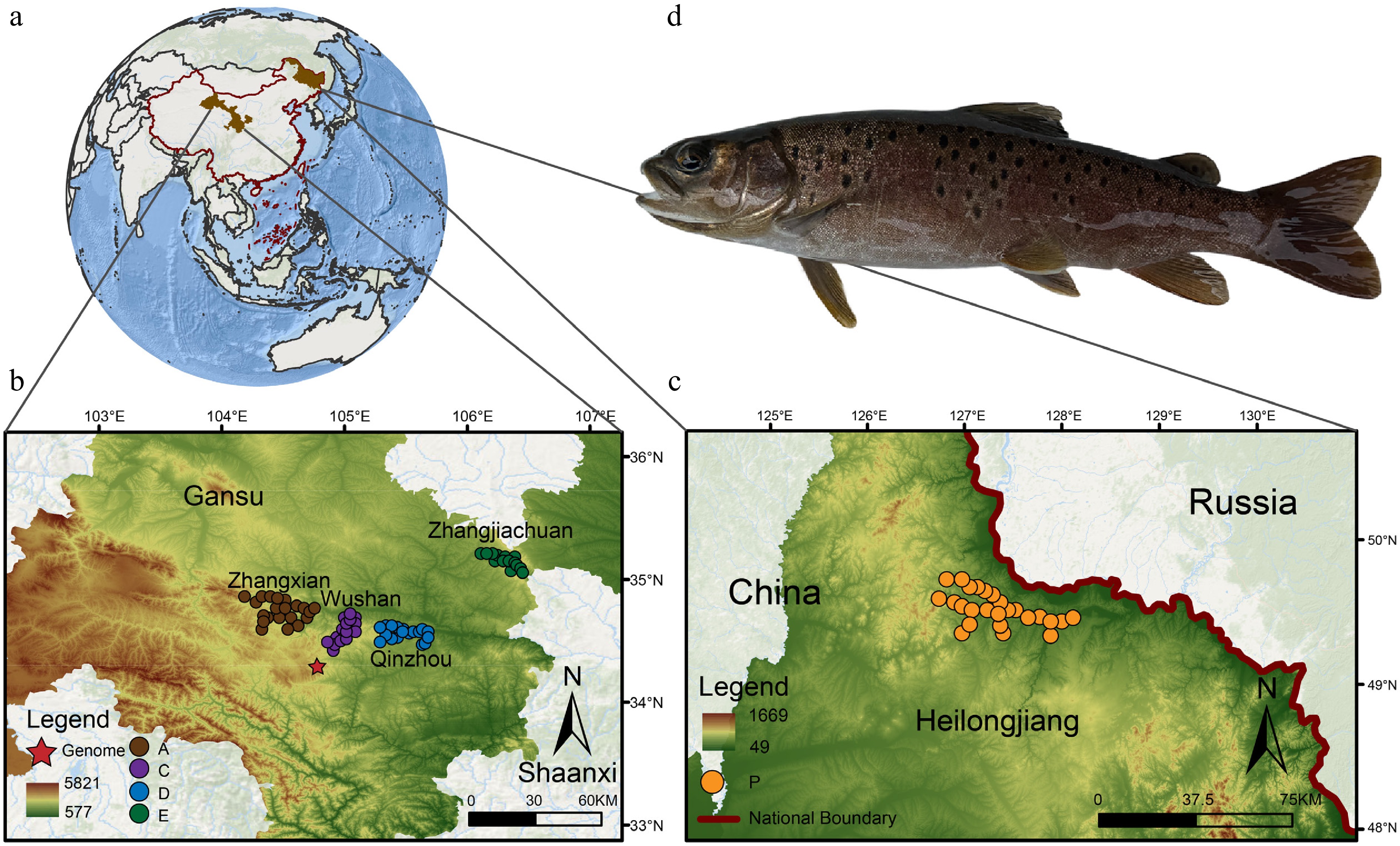 Geographical distribution of Brachymystax lenok tsinlingensis. A total of 124 individuals were collected from five representative geographic populations of B. lenok tsinlingensis across its distribution range in China: Zhangxian (population A), Wushan (population C), Qinzhou (population D), Zhangjiachuan (population E), and Xunke-Sunwu (population P). (a) Geographical location of the sampling sites. (b) Locations of sampling sites for populations A, C, D, and E. (c) Locations of sampling sites for population P. (d) Morphological photos of B. lenok tsinlingensis. Source: ArcMap V10.8, www.repeatmasker.org.