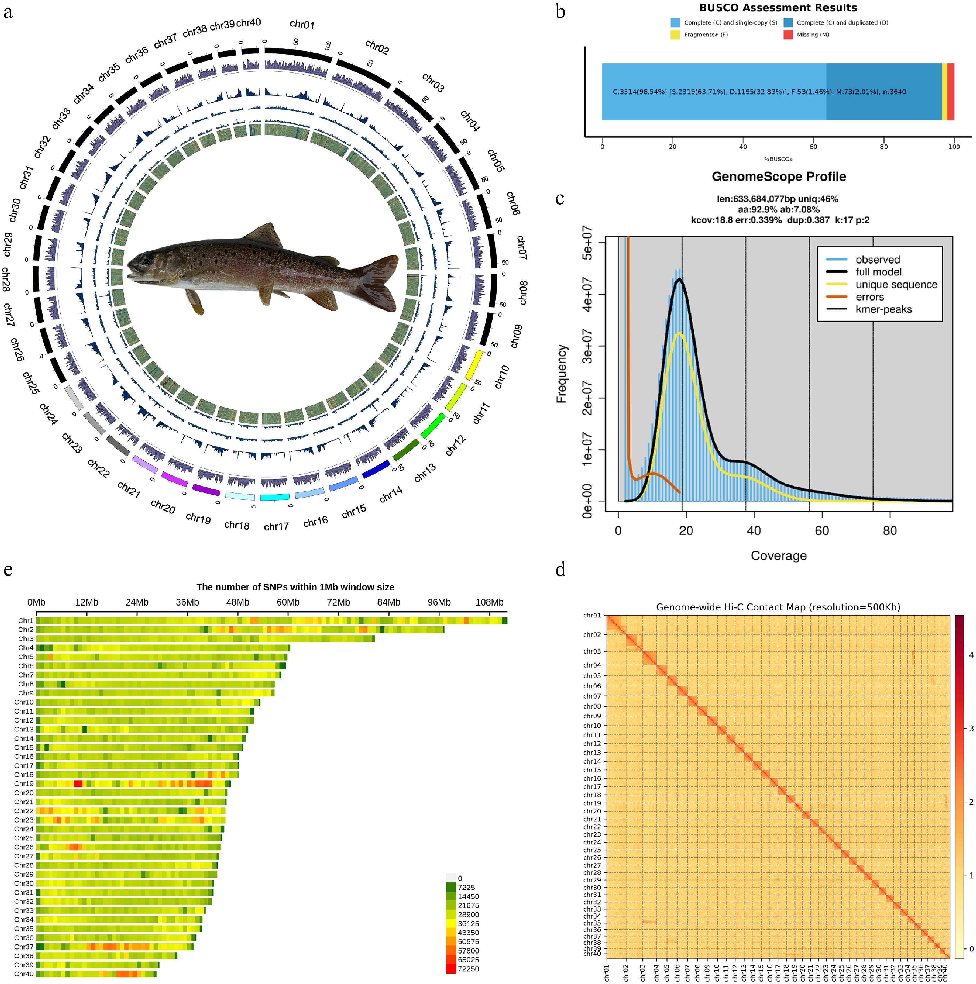 Genome and SNP landscape of Brachymystax lenok tsinlingensis. (a) Landscape of B. lenok tsinlingensis, from the innermost to the outermost layer, as follows: GC content, Copia TEs, Gypsy TEs, repeat, and gene density. (b) BUSCO assessment of genome assembly completeness. (c) Genome survey of B. lenok tsinlingensis based on K-mer analysis, the genome size was estimated to be 633.68 Mb with a duplication rate of 0.39%. (d) Hi-C contact map revealing extensive hierarchical chromatin interactions in the genome of B. lenok tsinlingensis. (e) Chromosomal distribution of identified single-nucleotide polymorphisms.