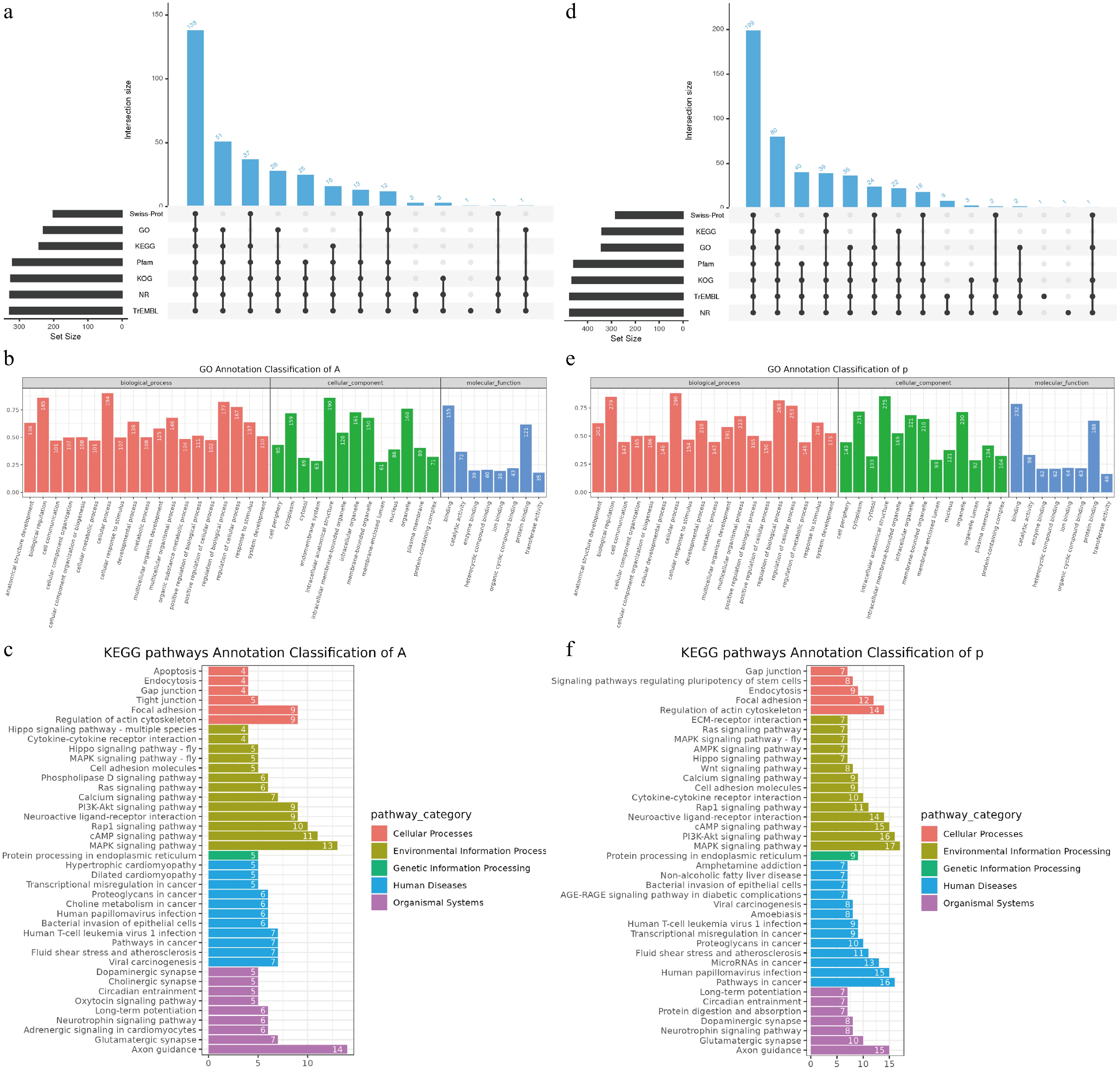 Population-specific functional enrichment and gene annotation. The upset bar plots show (a) the functional, (b) GO, and (c) KEGG pathway annotation of population A, and (d)–(f) population P.