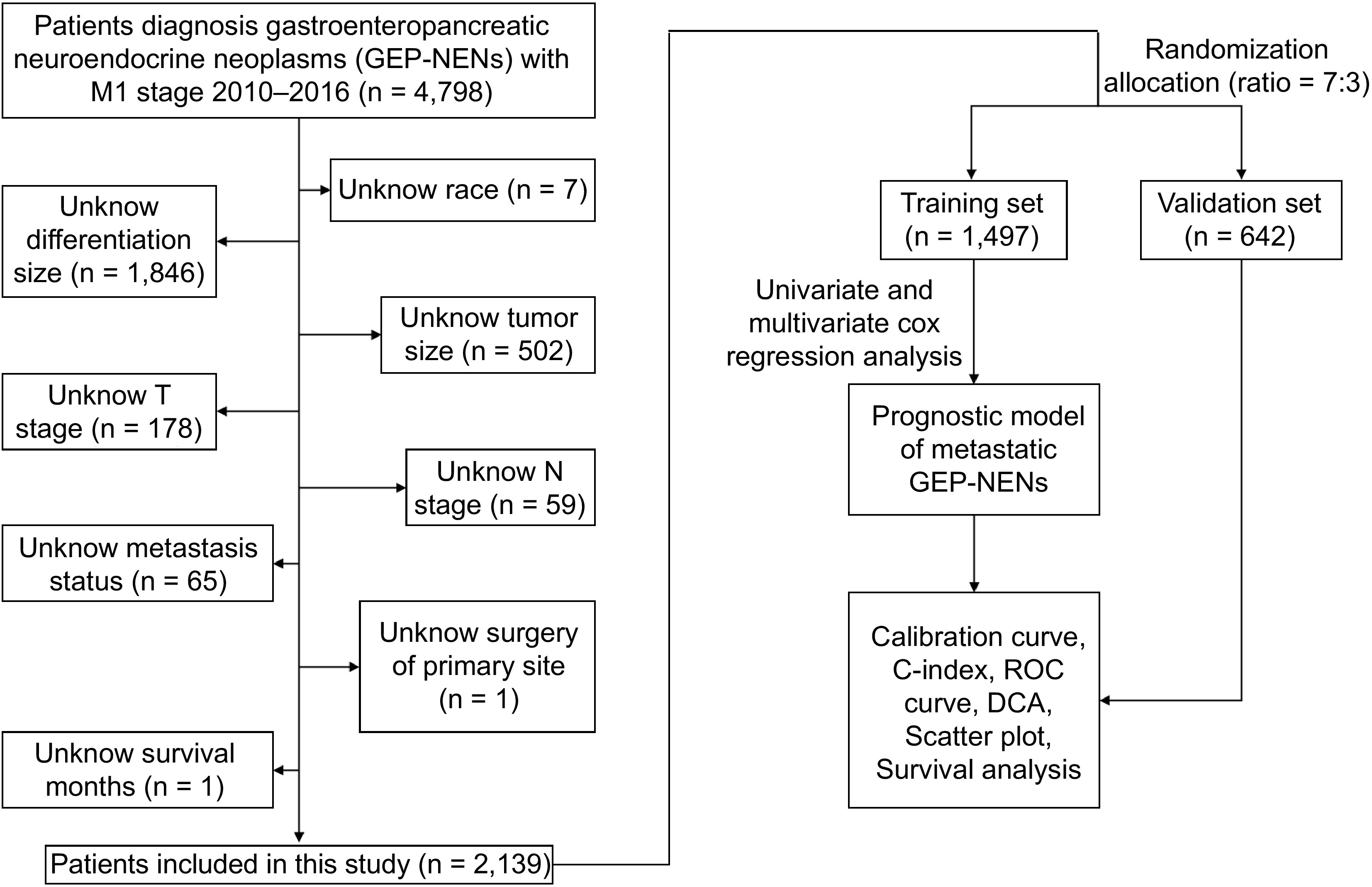 • First, the approval of the Surveillance, Epidemiology, and End Results (SEER) database (account ID: 12311-Nov2021) was acquired. Then, stage IV GEP-NENs patients were selected as the study object. Clinical data of GEP-NENs patients was downloaded from a database named 'SEER Research Plus Data, 18 Registries, Nov 2019 Sub (2000–2017)' via SEER. Stat software (version 8.4.0.1). 'SEER Research Plus Data, 18 Registries, Nov 2019 Sub (2000–2017)' is a subset of the SEER database and contains the newly diagnosed tumor patients from 2000 to 2017. The clinical data of individuals with stage IV GEP-NENs were examined using a retrospective analysis. The following is a list of the requirements for inclusion: (a) patients were diagnosed with NENs based on histopathology, (b) primary NENs originated from the gastrointestinal tract or pancreas, and (c) the American Joint Committee on Cancer (AJCC) stage IV was confirmed, which was used the 7th edition of AJCC classification system[13]. Patients were identified by the International Classification of Disease for Oncology, third edition (ICD-O-3) for histology type codes (8013, 8150, 8151, 8152, 8153, 8154, 8156, 8240, 8241, 8243, 8244, 8245, 8246, and 8249) and primary site codes (C16.0 to C16.6, C16.8 to C16.9, C17.0 to C17.3, C17.8 to C17.9, C18.0 to C18.9, C19.9, C20.9, C24.1, C25.0 to C25.2, C25.4, and C25.7 to C25.9). The exclusion criteria were unknown race, tumor differentiation, tumor size, T and N stage, metastasis status and surgery of primary site, and incomplete survival data. It is worth noting that patients diagnosed from 2010–2017 were included in this study due to their detailed metastasis data since 2010. Based on the above screening criteria, all cases were randomly allocated to the training set and validation set at a proportion of 70%:30%.