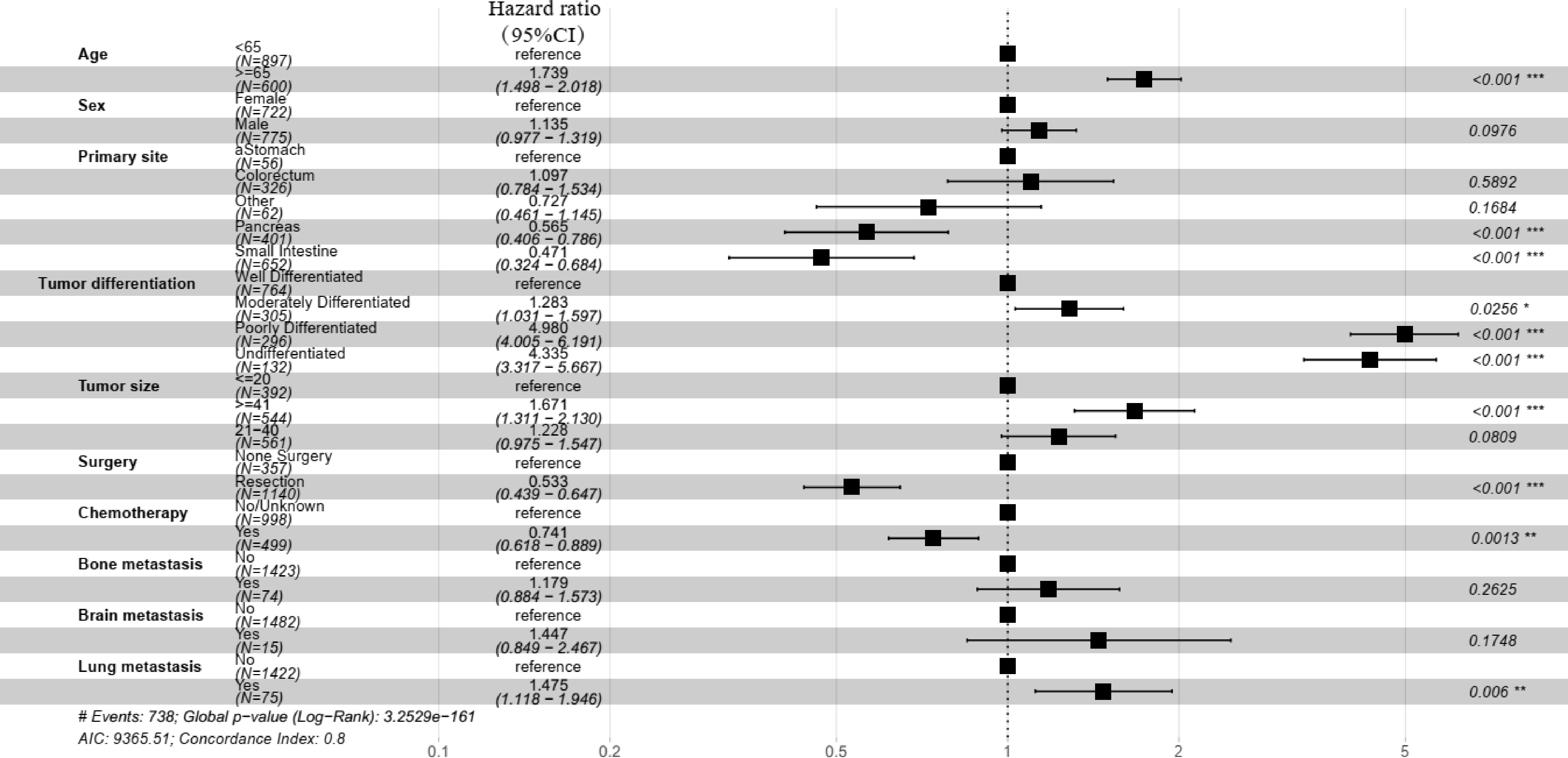• The Cox proportional hazards regression model was utilized to identify factors that might increase the risk of overall survival. The result showed that age, sex, primary site, tumor differentiation, tumor size, surgery, chemotherapy, bone metastasis, brain metastasis, and lung metastasis were the risk factors influencing the overall survival of patients (p < 0.05) (Table 2). Additionally, a multivariate analysis was conducted to confirm the independent risk factor of overall survival. According to the result, the independent risk factors were listed as follows: age, primary site, tumor differentiation, tumor size, surgery, chemotherapy, and lung metastasis (p < 0.05) (Table 2). As shown in Fig. 2, independent risk factors that correlated with overall survival were identified in the training set.