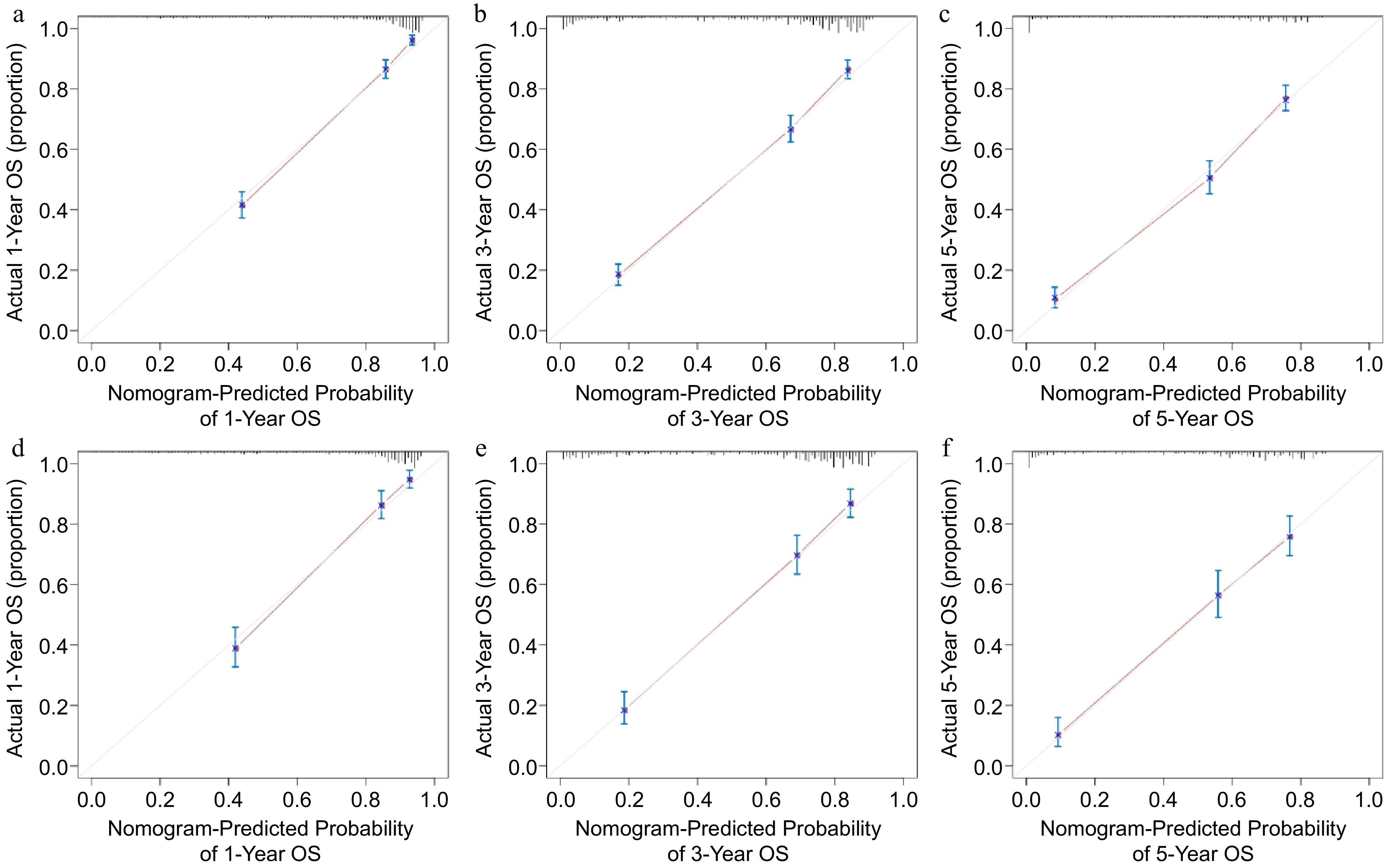 Calibration curve analysis of the nomogram predicting survival probabilities. Nomogram-predicting (a) 1-year, (b) 3-year, and (c) 5-year survival probabilities in the training group. Nomogram-predicting (d) 1-year, (e) 3-year, and (f) 5-year survival probabilities in the validation group.