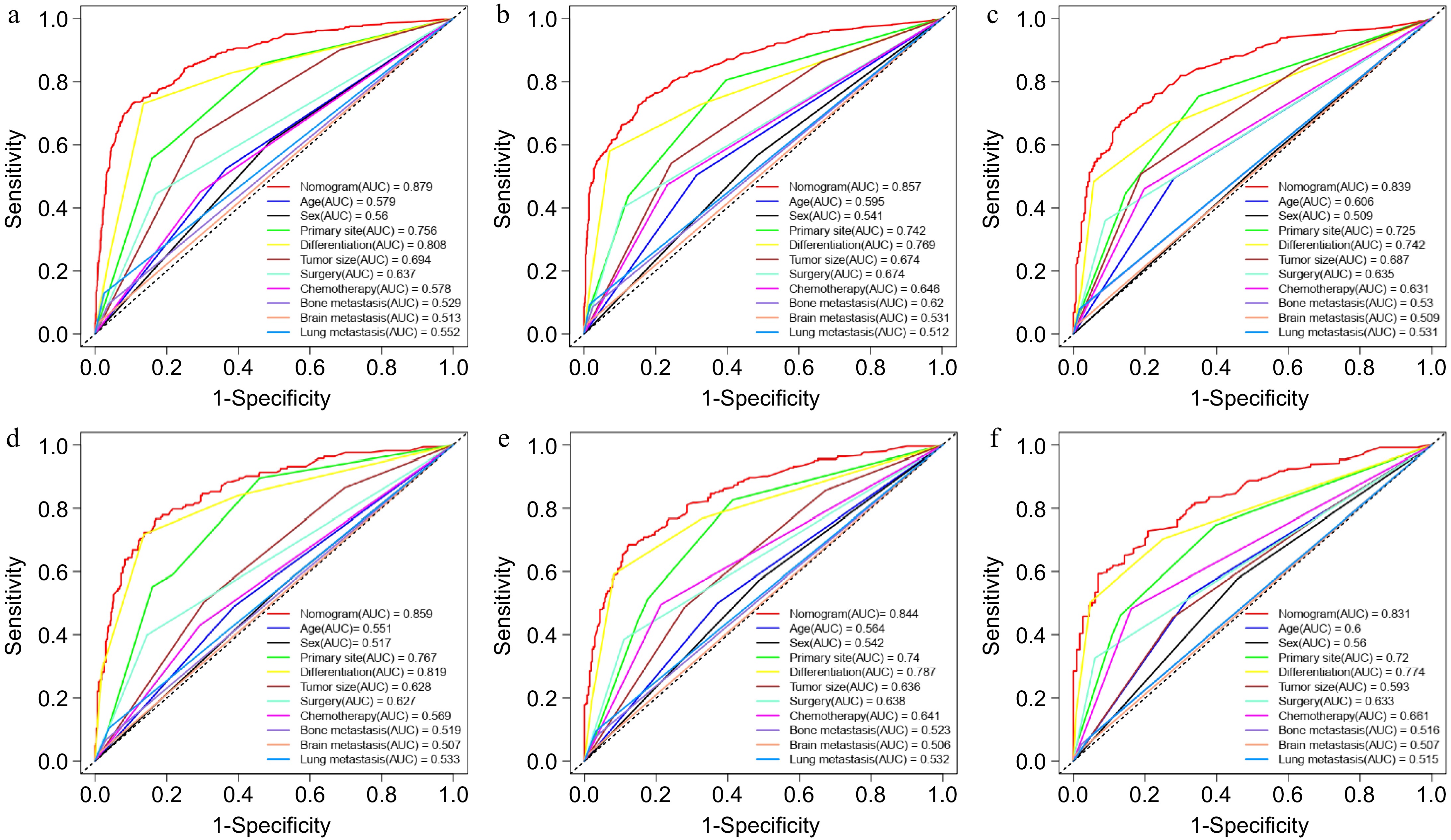 ROC analysis and AUC evaluating the accuracy of nomogram- and risk factor-predicting overall survival. (a) 1-year, (b) 3-year, and (c) 5-year OS in the training group. (d) 1-year, (e) 3-year, and (f) 5-year OS in the validation group.