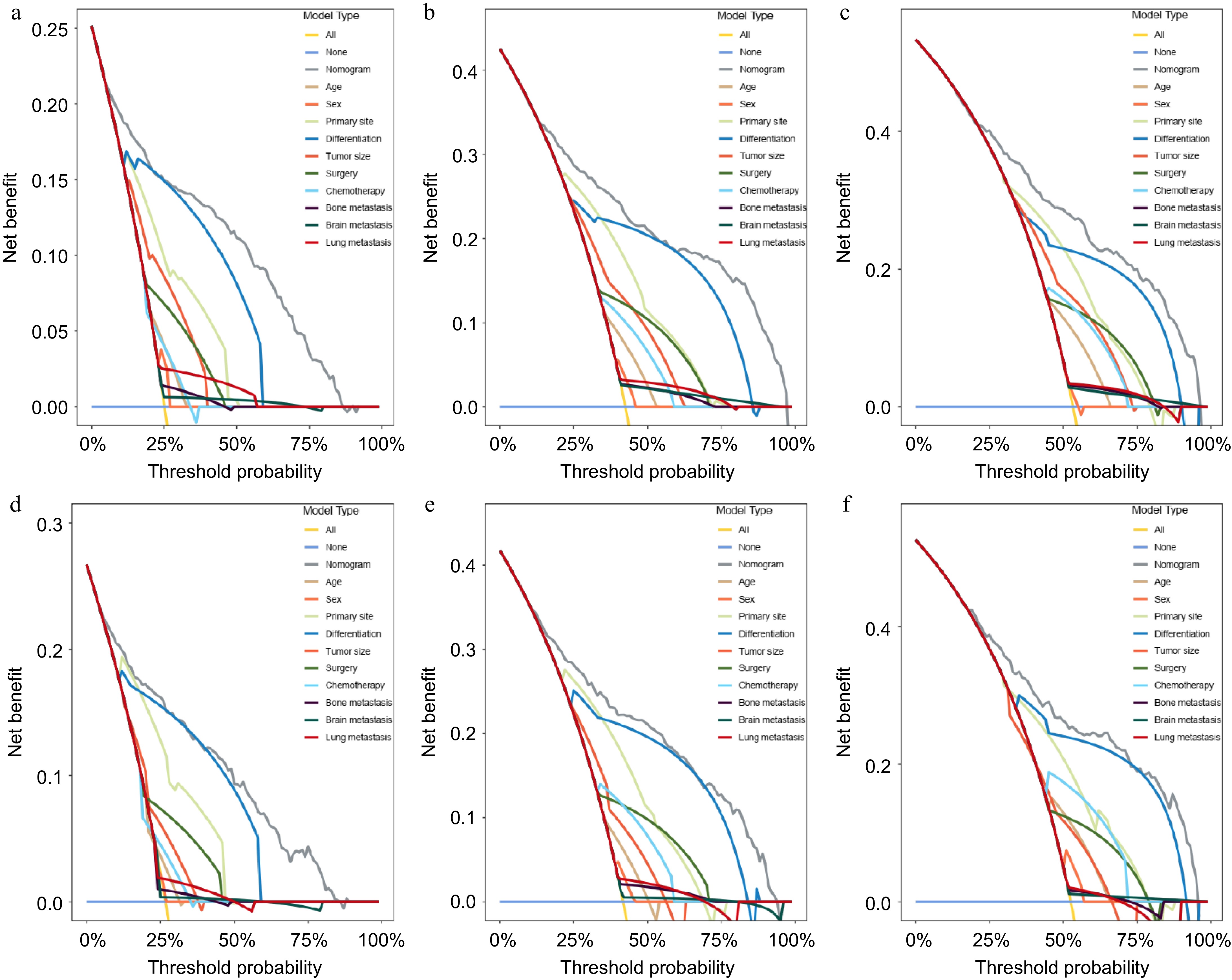 DCA analysis of the clinical benefit of the nomogram- and risk factor-predicting in the training group and validation group. (a) 1-year, (b) 3-year, and (c) 5-year OS in the training group. (d)1-year, (e) 3-year, and (f) 5-year OS in the validation group.