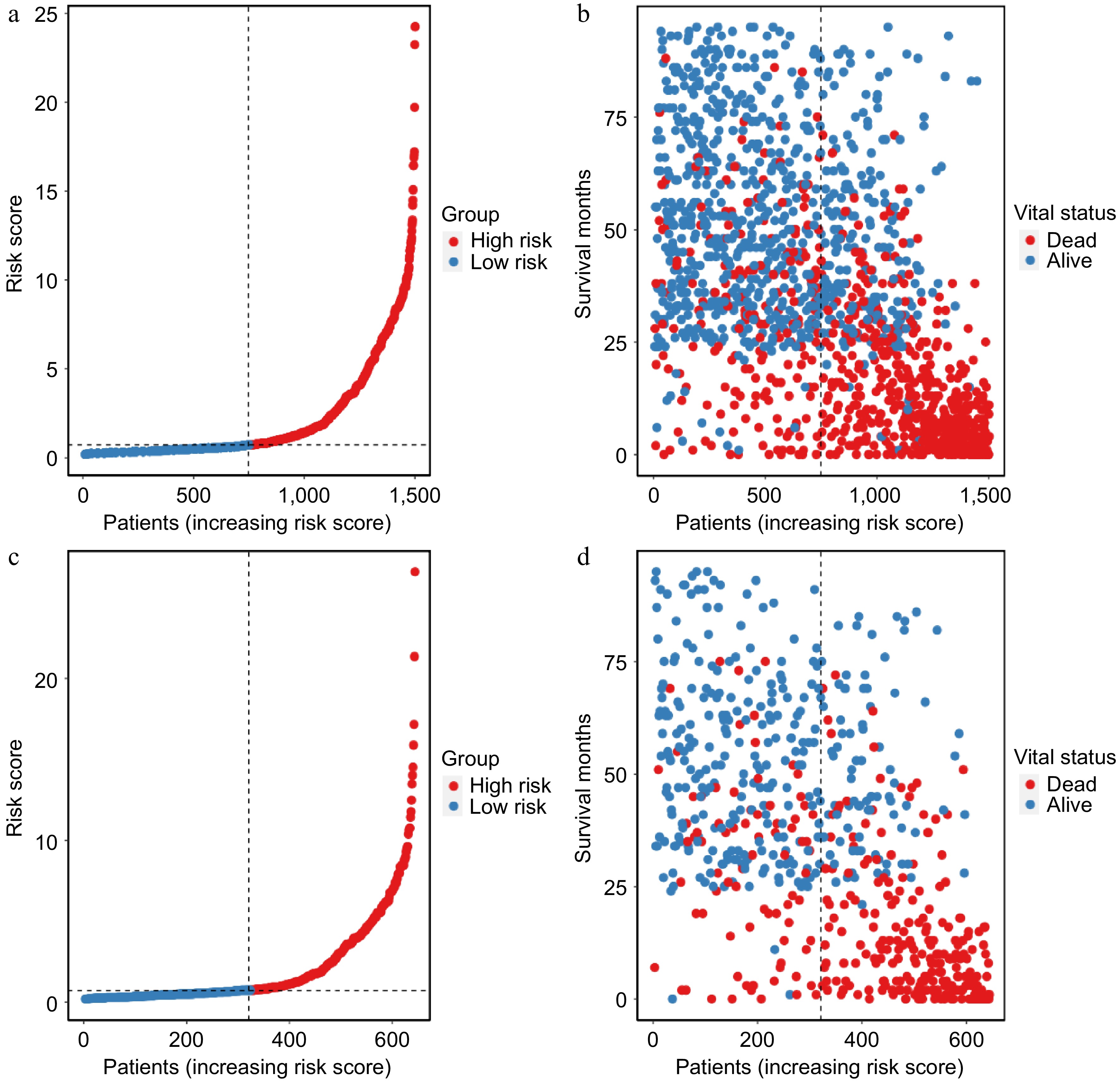 Scatter plot demonstrating the risk score distribution and survival status in the (a), (b) training cohort, and the (c), (d) validation cohort.