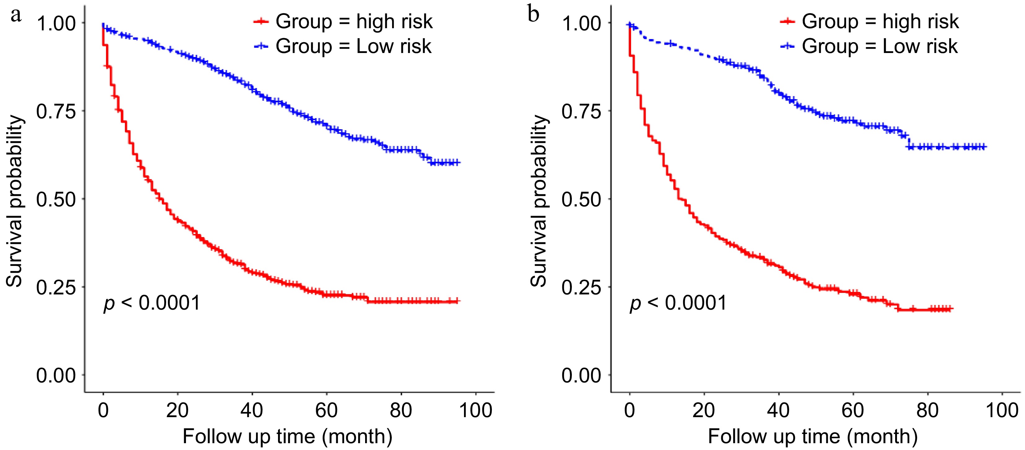Kaplan-Meier analysis of the survival difference between the high-risk and the low-risk groups based on the nomogram in the (a) training group, and the (b) validation group.