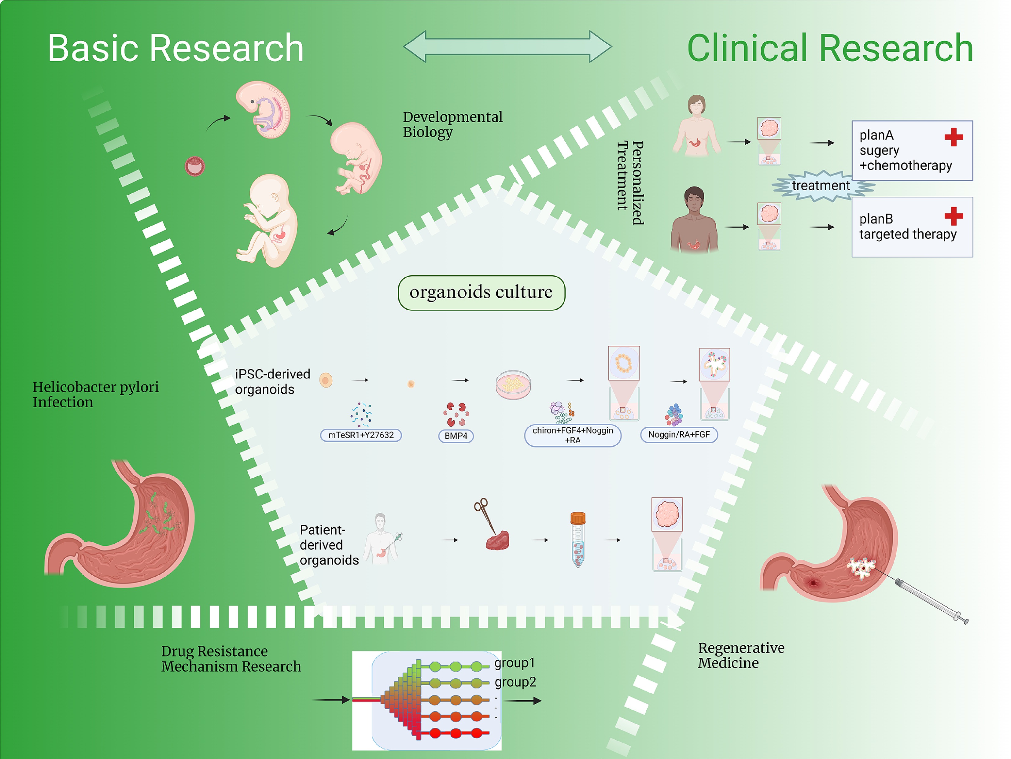 Organoid generation and applications. The figure depicts the standard methodology for generating gastric organoids and highlights their applications in developmental biology, modeling of H. pylori infection, gastric cancer and drug resistance mechanism research, personalized treatment, and regenerative medicine. Created in BioRender. Chen, E. (2025) https://BioRender.com/t04o468.