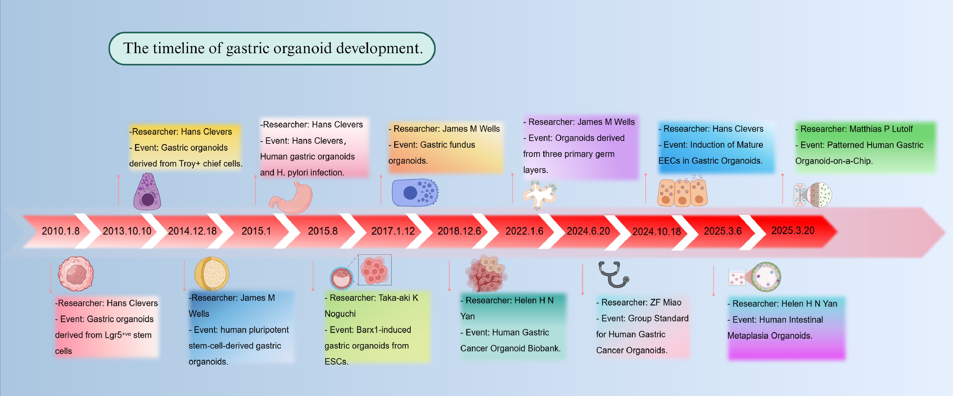 Timeline of gastric organoid development. The figure illustrates the establishment of the first organoid and major milestones in the development and application of gastric organoid models from 2013 to 2025. Created in BioRender. Chen, E. (2025) https://BioRender.com/9dh4twy.