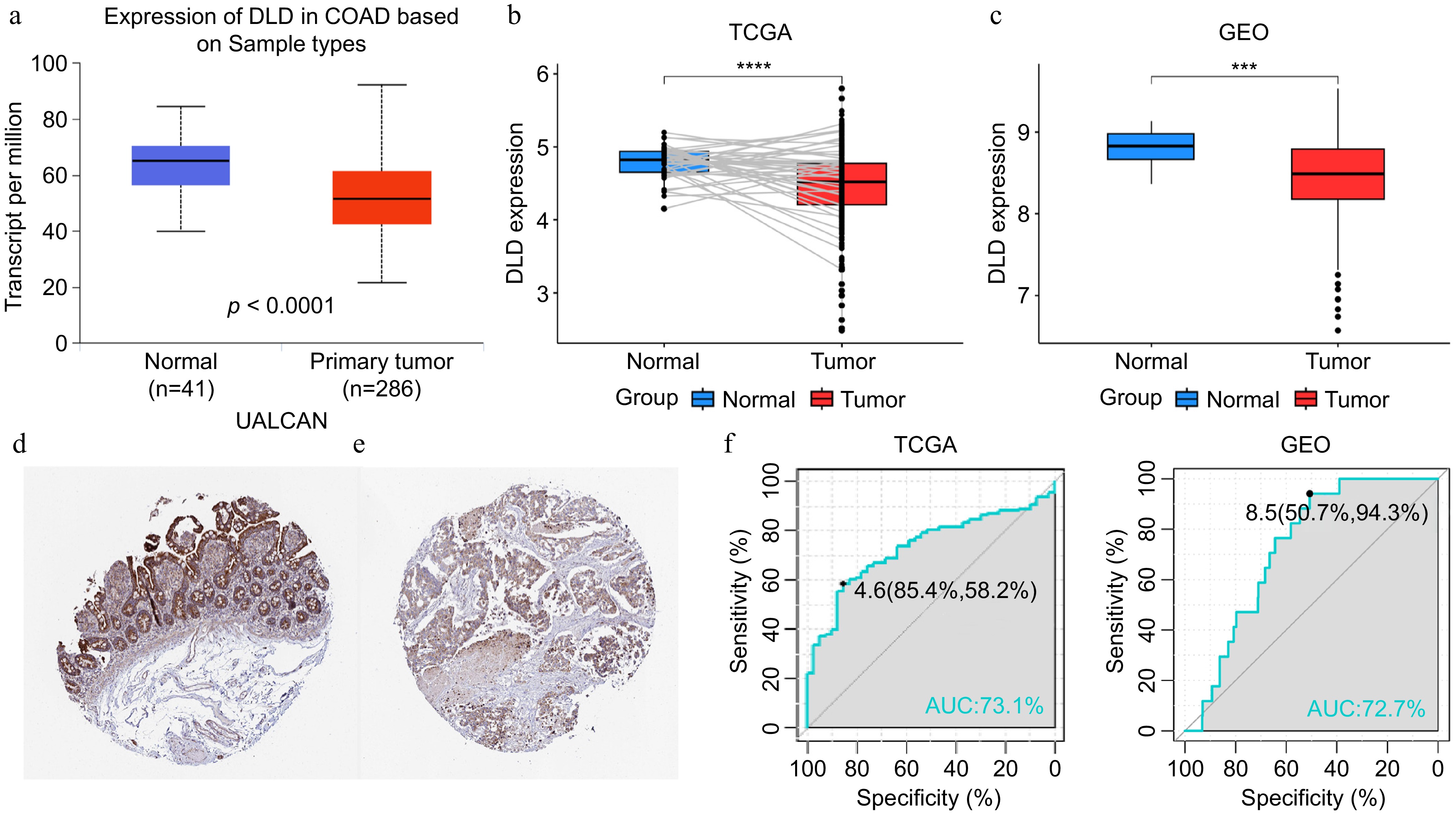 DLD expression in colon cancer (CC). (a) mRNA expression of DLD in normal tissues and CC tissues, sourced from the the University of Alabama at Birmingham Cancer data analysis Portal (UALCAN) database. (b) Paired expression analysis of DLD in normal and colon adenocarcinoma (COAD) tissues sourced from The Cancer Genome Atlas (TCGA) database. (c) Expression analysis of DLD in normal and CC tissues sourced from the Gene Expression Omnibus (GEO) database. (d) Levels of DLD protein in normal colon tissues sourced from the Human Protein Atlas. (e) Levels of DLD protein in COAD tissues in the Human Protein Atlas database. (f), (g) The receiver operating characteristic (ROC) curve showed the high expression specificity of DLD in the TCGA database and GEO databases for CC. AUC, area under the curve. *** p < 0.001, **** p < 0.0001.
