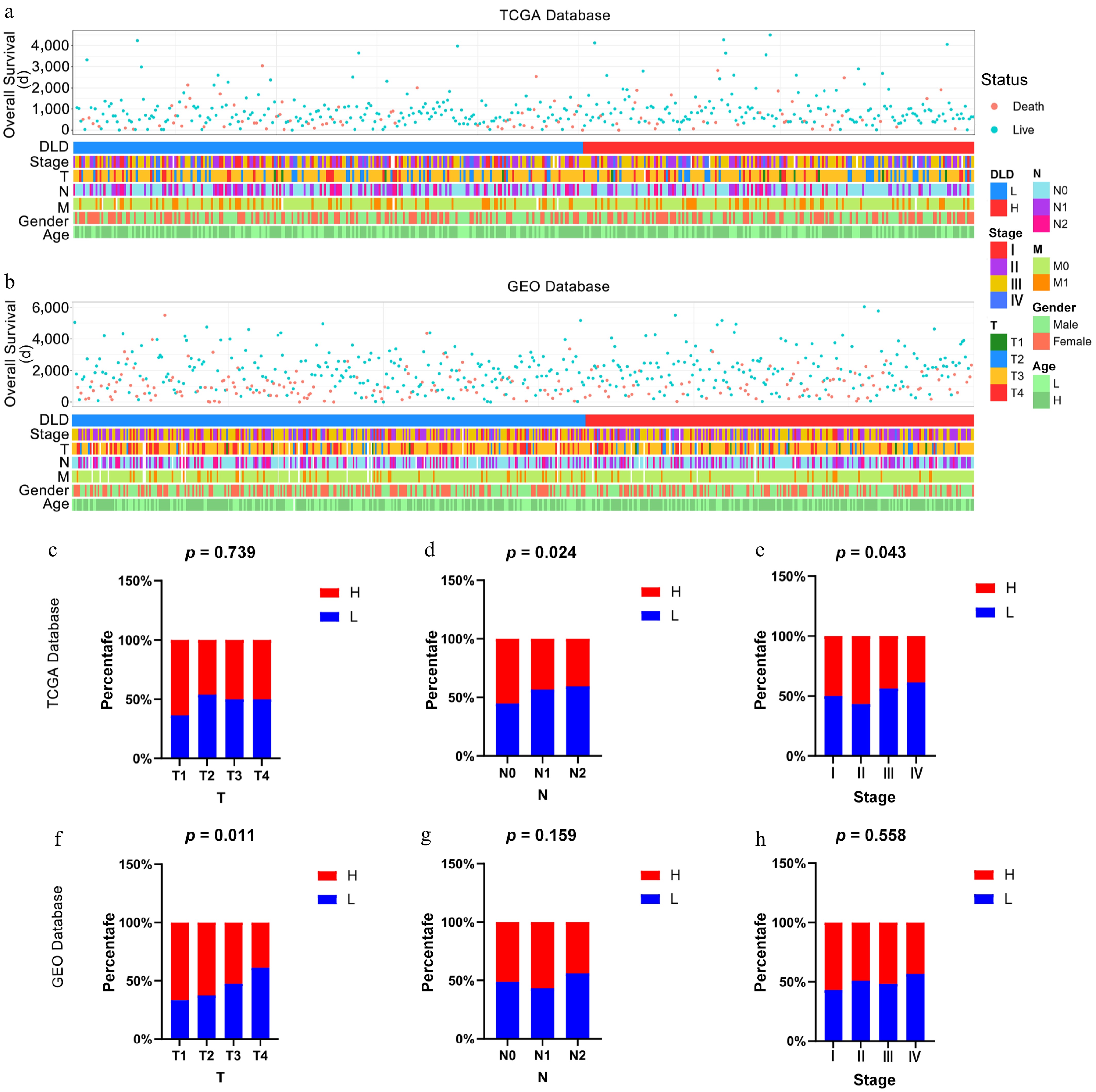 Relationship between DLD and clinicopathological features of colon cancer (CC). (a) Status of clinicopathological features of CC associated with DLD in The Cancer Genome Atlas (TCGA) database. (b) Status of clinicopathological features of CC associated with DLD in the Gene Expression Omnibus (GEO) database. (c)–(h) Correlation of DLD expression with clinicopathological parameters including clinical stages, lymph node invasion, and pathological stage in CC patients in the TCGA database and GEO database. The significance of differences was tested by the χ2-test.