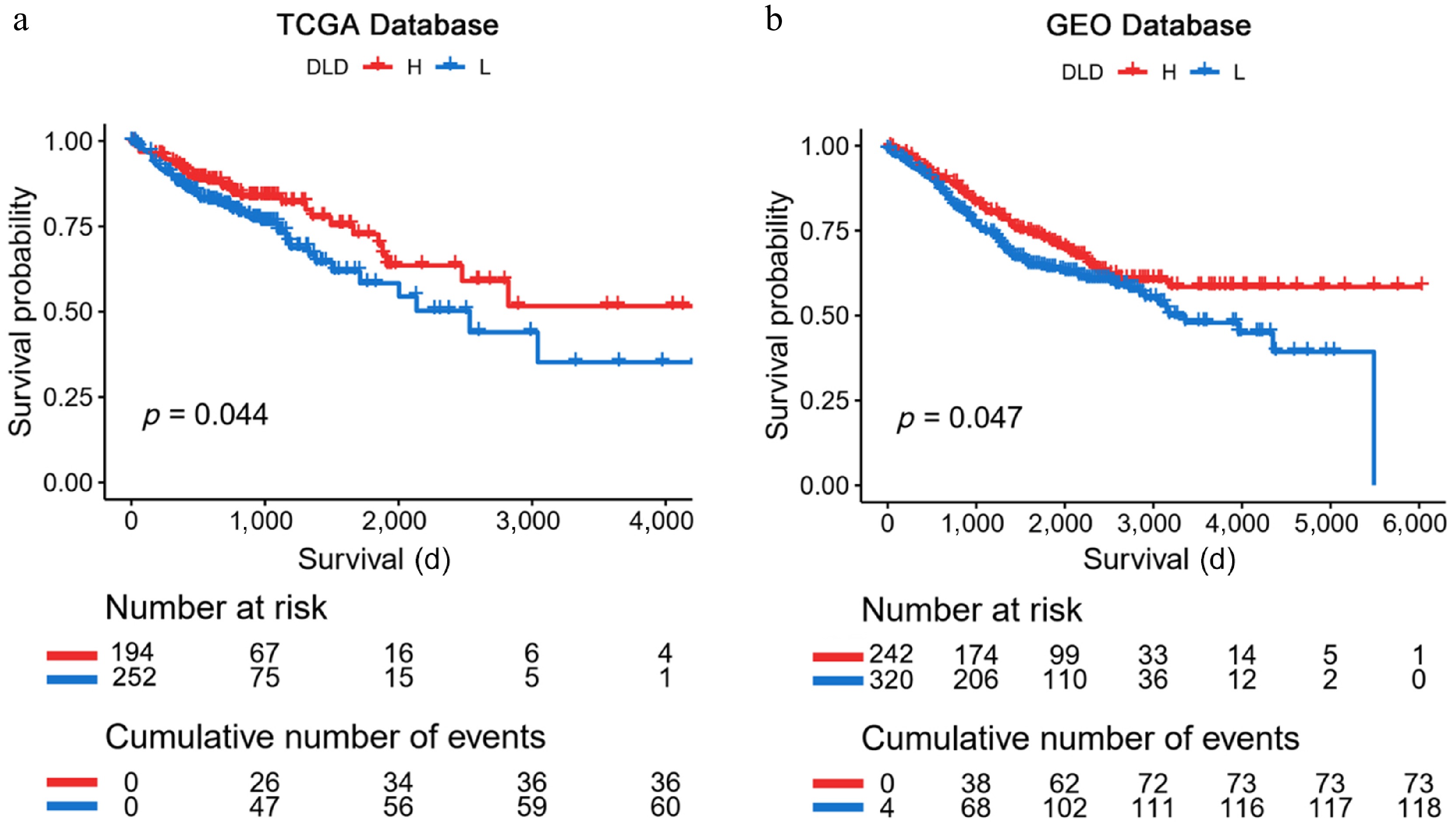 Kaplan-Meier analysis of DLD expression in The Cancer Genome Atlas (TCGA) database and the Gene Expression Omnibus (GEO) database. (a), (b) Kaplan-Meier plots verified that high DLD mRNA levels are associated with better survival outcomes in patients with CC. Significance of prognostic value was tested by log-rank test.