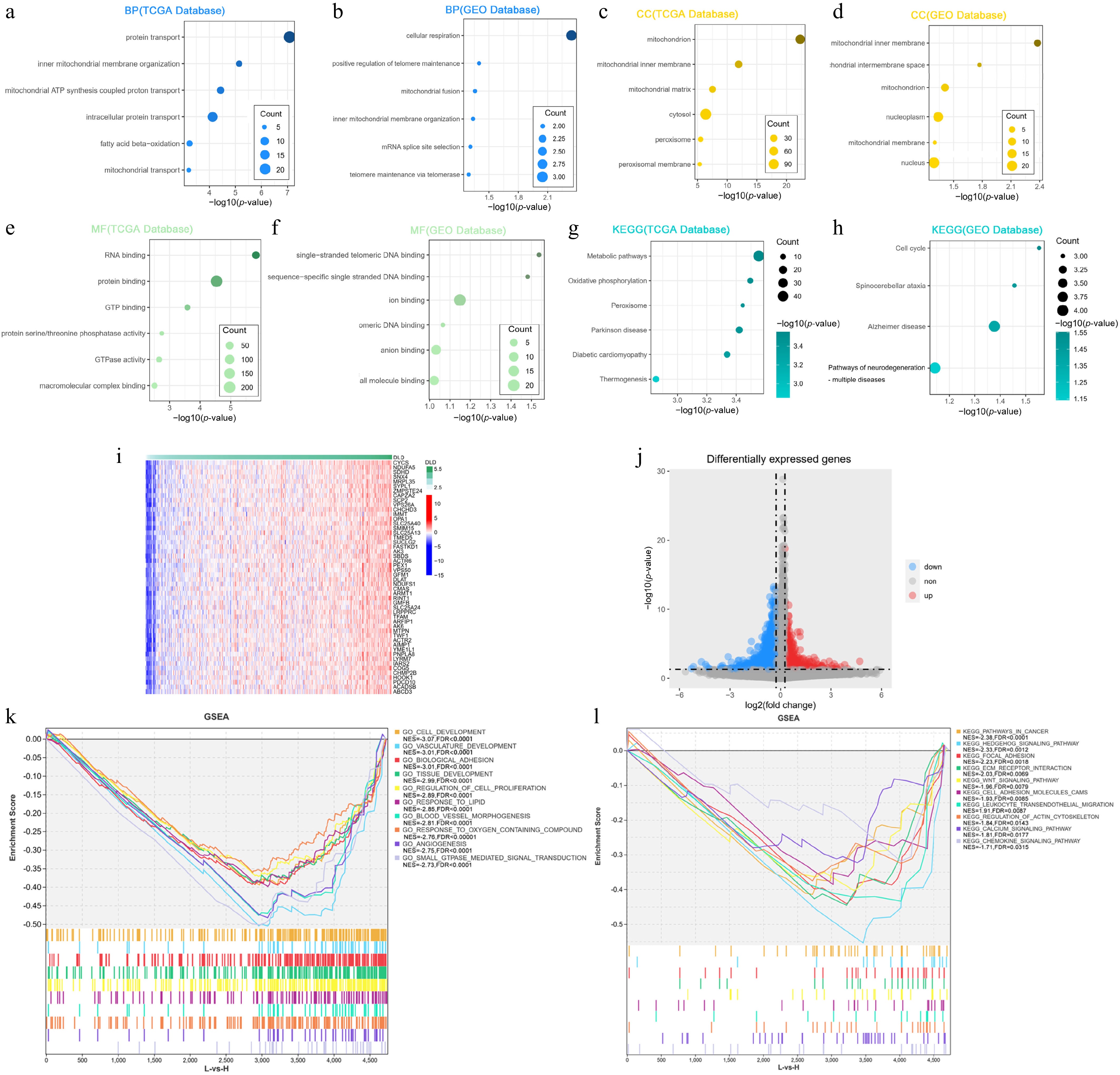 DLD is closely related to the regulation of metabolic processes in CC. (a), (b) Biological processes (BP) mostly associated with DLD in The Cancer Genome Atlas (TCGA) database and the Gene Expression Omnibus (GEO) database. (c), (d) Cellular components (CC) mostly associated with DLD in the TCGA database and GEO database. (e), (f) The most relevant molecular functions (MFs) of DLD in the TCGA database and the GEO database. (g), (h) KEGG pathway analysis of DLD in the TCGA database and GEO database. (i) Heat map showing the top 50 co-expressed genes positively associated with DLD expression in the TCGA dataset. (j) Volcano plot showing differentially expressed genes in the high-DLD group versus the low-expression group in the TCGA dataset. (k), (l) Gene Ontology (GO) function and KEGG pathway enrichment analysis of differentially expressed genes in the high- versus low-DLD groups in the TCGA dataset.