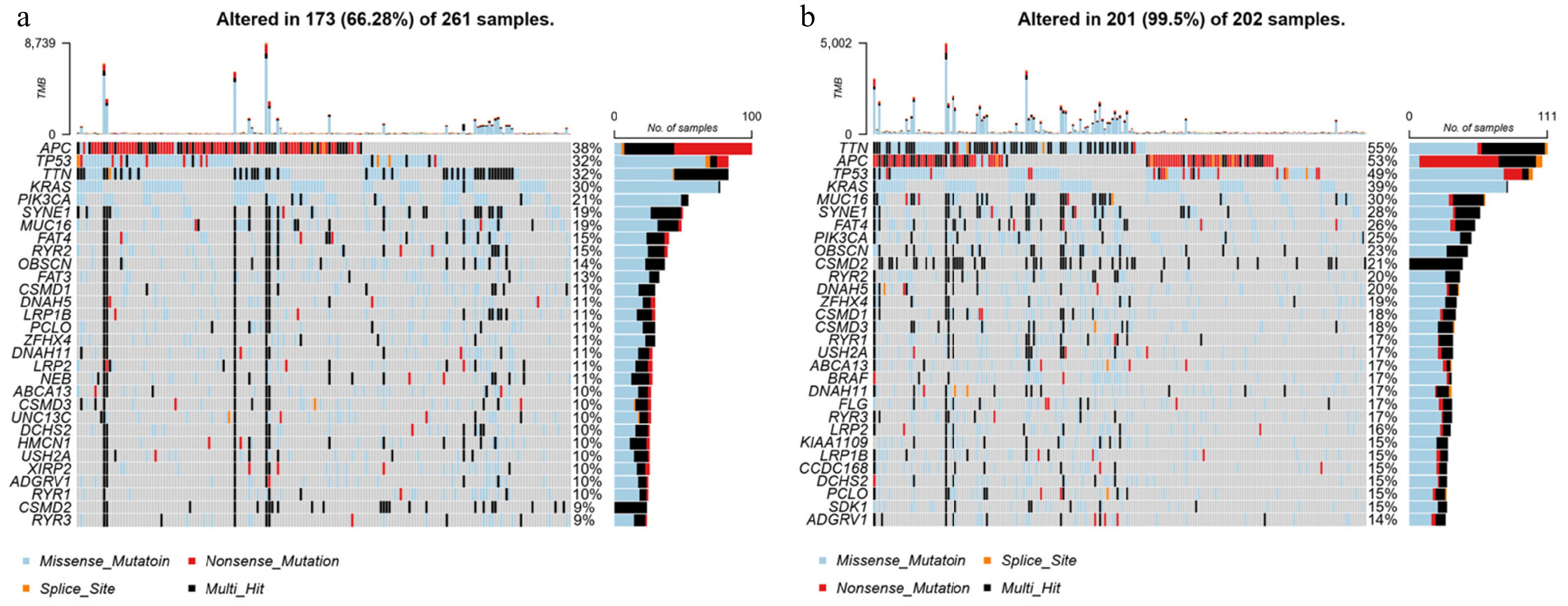Somatic mutation analysis in groups with high and low expression of DLD. Waterfall plot of the top 30 mutational genes in the (a) high-DLD group and (b) low-DLD group.