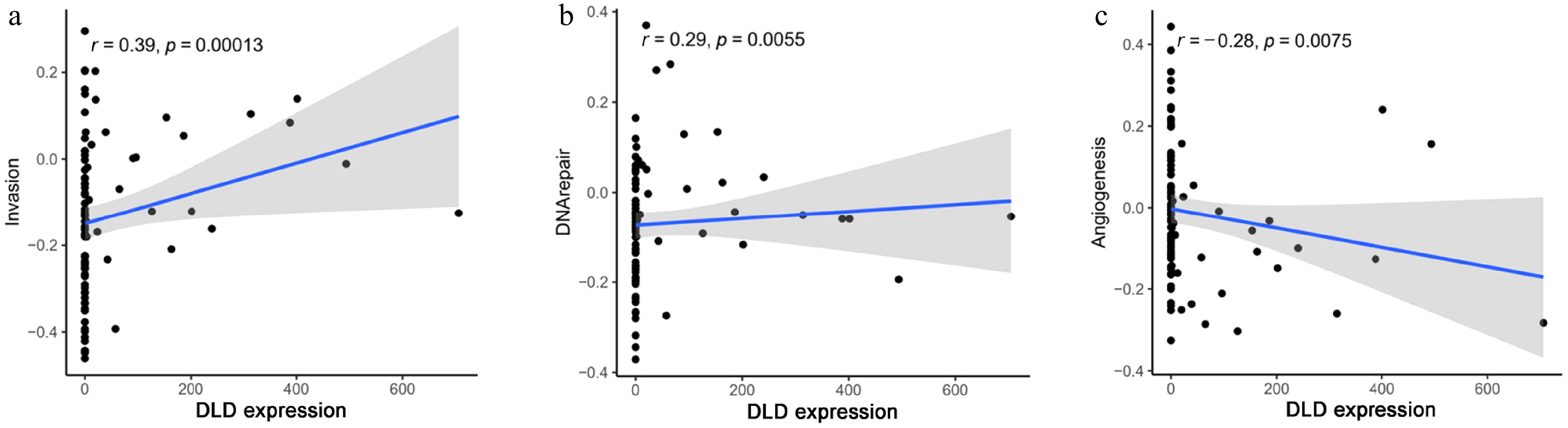 Correlation between DLD expression and significantly different functional states in CC: (a) invasion, (b) DNA repair, and (c) angiogenesis.