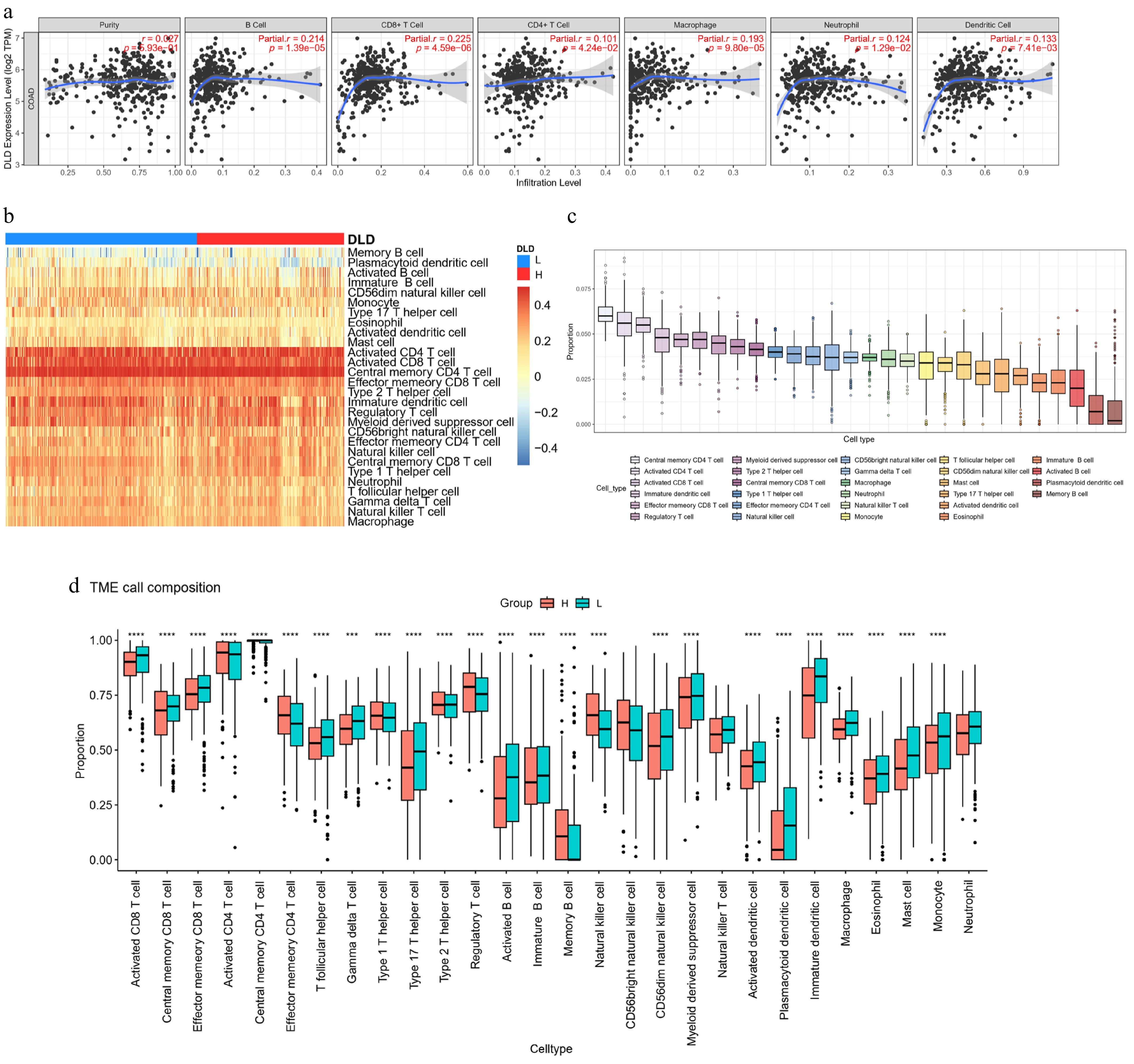 DLD expression correlates with the degree of immune infiltration in CC. (a) Spearman's correlation between DLD expression and the abundance of six types of infiltrating immune cells. (b) Heat map showing differences in immune cell infiltration between the high- and low-DLD groups. (c) Proportion of 28 immune cell subtypes infiltrating in CC. (d) Changes in 28 immune cell subtypes between the high- and low-DLD groups in CC tumor samples. * p < 0.05; ** p < 0.01; *** p < 0.001; **** p < 0.0001.