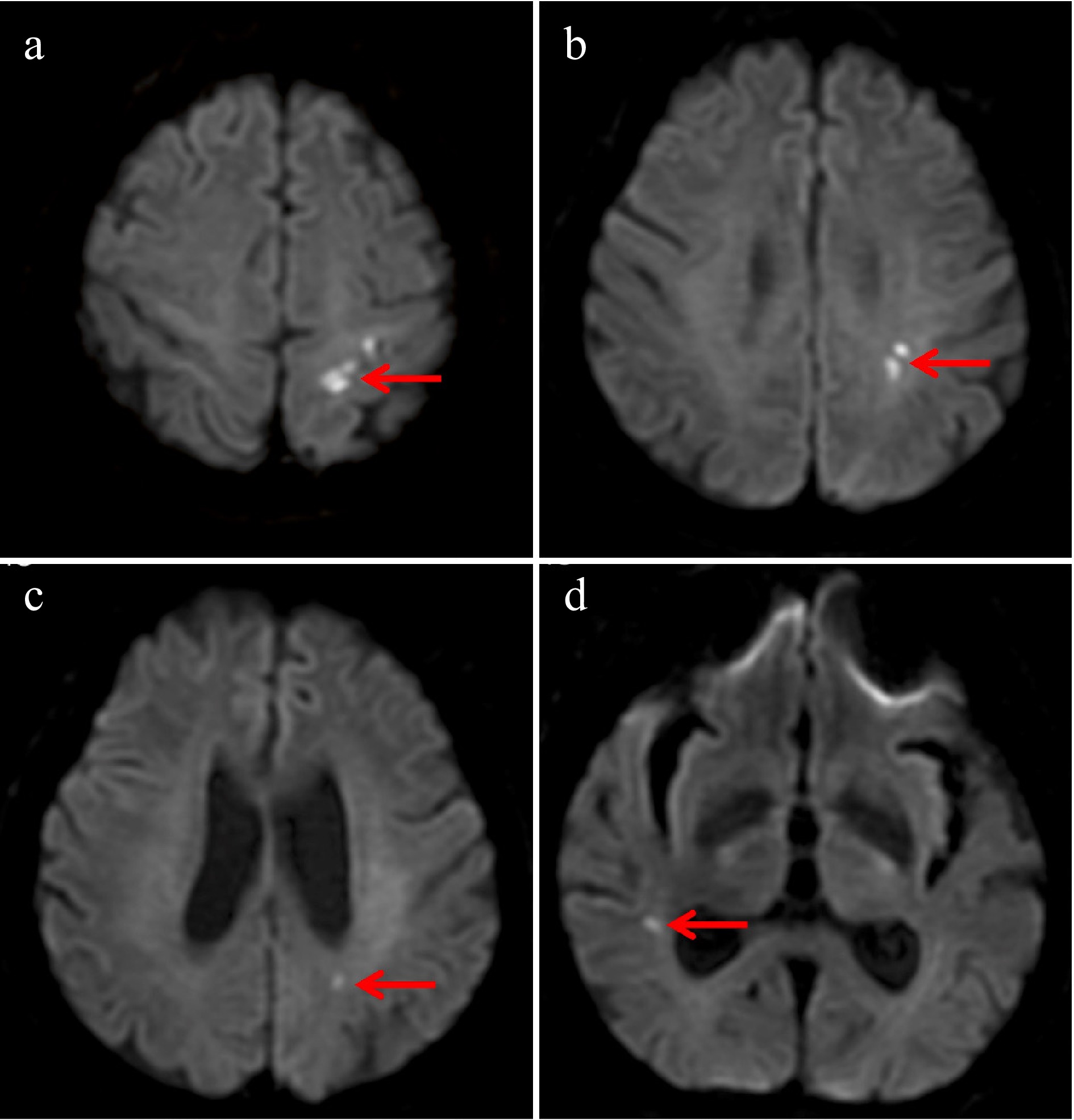 Brain magnetic resonance imaging–diffusion-weighted imaging (MRI-DWI) demonstrated multiple cerebral infarctions involving both the anterior and posterior circulations. Acute infarction in (a) the left anterior cerebral artery (ACA) region, (b) the left middle cerebral artery (MCA) region, (c) the left posterior cerebral artery (PCA) region, and (d) the right MCA region.