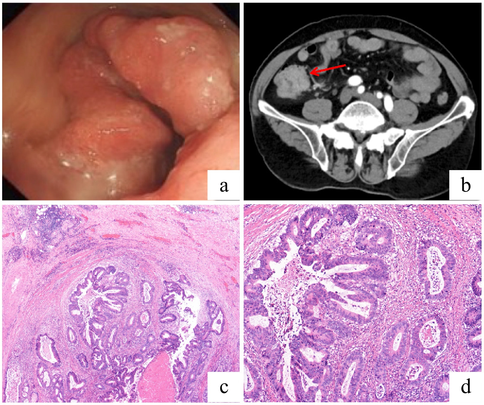 Diagnostic and histopathological findings of ileocecal adenocarcinoma. (a) Colonoscopic view of a large, irregular mass in the ileocecal region. (b) Contrast-enhanced abdominal CT scan (axial view) showing irregular wall thickening with a marked enhancement in the ascending colon and ileocecal region. (c) Low-power photomicrograph (hematoxylin and eosin [HE] staining) of the resected specimen revealing an ulcerated, moderately differentiated adenocarcinoma with transmural invasion into the muscular layer. (d) High-power photomicrograph (HE staining) demonstrating the neoplastic glands with enlarged, hyperchromatic nuclei and evident mitotic activity. No significant perineural or lymphovascular invasion was identified.