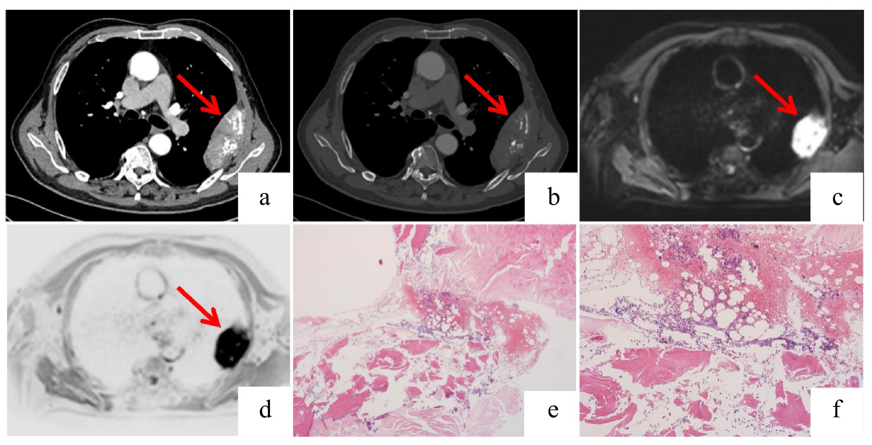 Imaging and histopathological findings of the plasmacytoma. (a), (b) Axial and coronal contrast-enhanced chest CT scans demonstrating irregular left pleural thickening (measuring approximately 9.8 × 3.1 cm in the maximum cross-section) with associated destruction of the adjacent rib. (c), (d) Fusion positron emission tomography (PET)-MRI images reveal a rounded mass in the left chest wall showing hyperintensity on DWI with corresponding hypointensity on the apparent diffusion coefficient (ADC) map, consistent with restricted diffusion. Increased signal intensity is also noted in the adjacent rib on the MRI sequence. (e), (f) The bone marrow biopsy specimens show scattered plasma cells with lambda light chain restriction indicated by immunohistochemistry: (f) lambda-positive; (e) kappa-negative. This confirmed the presence of monoclonal plasma cells. The overall cellularity and number of plasma cells were not significantly increased.