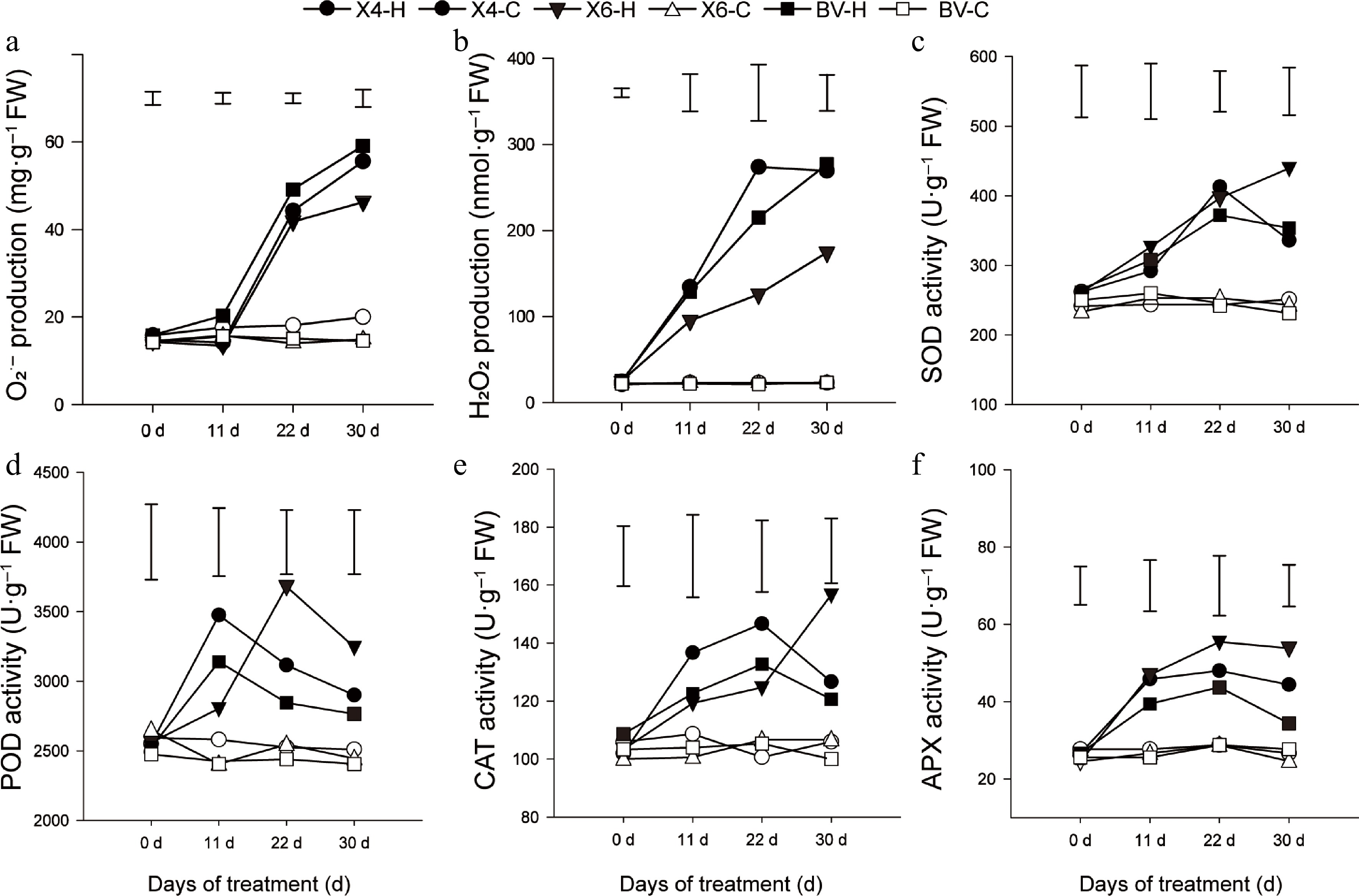 Since heat stress could trigger a marked, time-dependent surge in reactive oxygen species (ROS), the superoxide anion (O2·−) production and hydrogen peroxide (H2O2) contents were further measured, as well as the activities of four ROS-scavenging enzymes (Fig. 2a, b). The difference among varieties became evident after 11 d of heat treatment that reached significant differences after 22 to 30 d of the treatment: by day 30, 'BV' leaves showed the highest ROS burden, with O2·− and H2O2 levels climbing to roughly 55 % and 59 % above their respective controls, whereas 'X6' consistently maintained the lowest O2·− and H2O2 concentrations under heat stress among the tested varieties (Fig. 2a, b), highlighting its superior capacity to restrain ROS build-up during the prolonged heat stress.