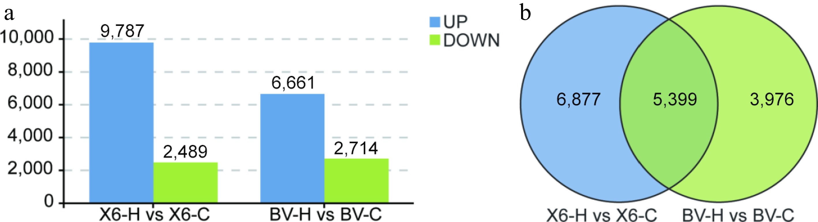 Number of differentially expressed genes (DEGs) of two ryegrass varieties with contrasting heat tolerance. (a) Number of up- or down-regulated DEGs. (b) Venn diagram of DEGs in different groups between 'X6-H vs X6-C' and 'BV-H vs BV-C'.