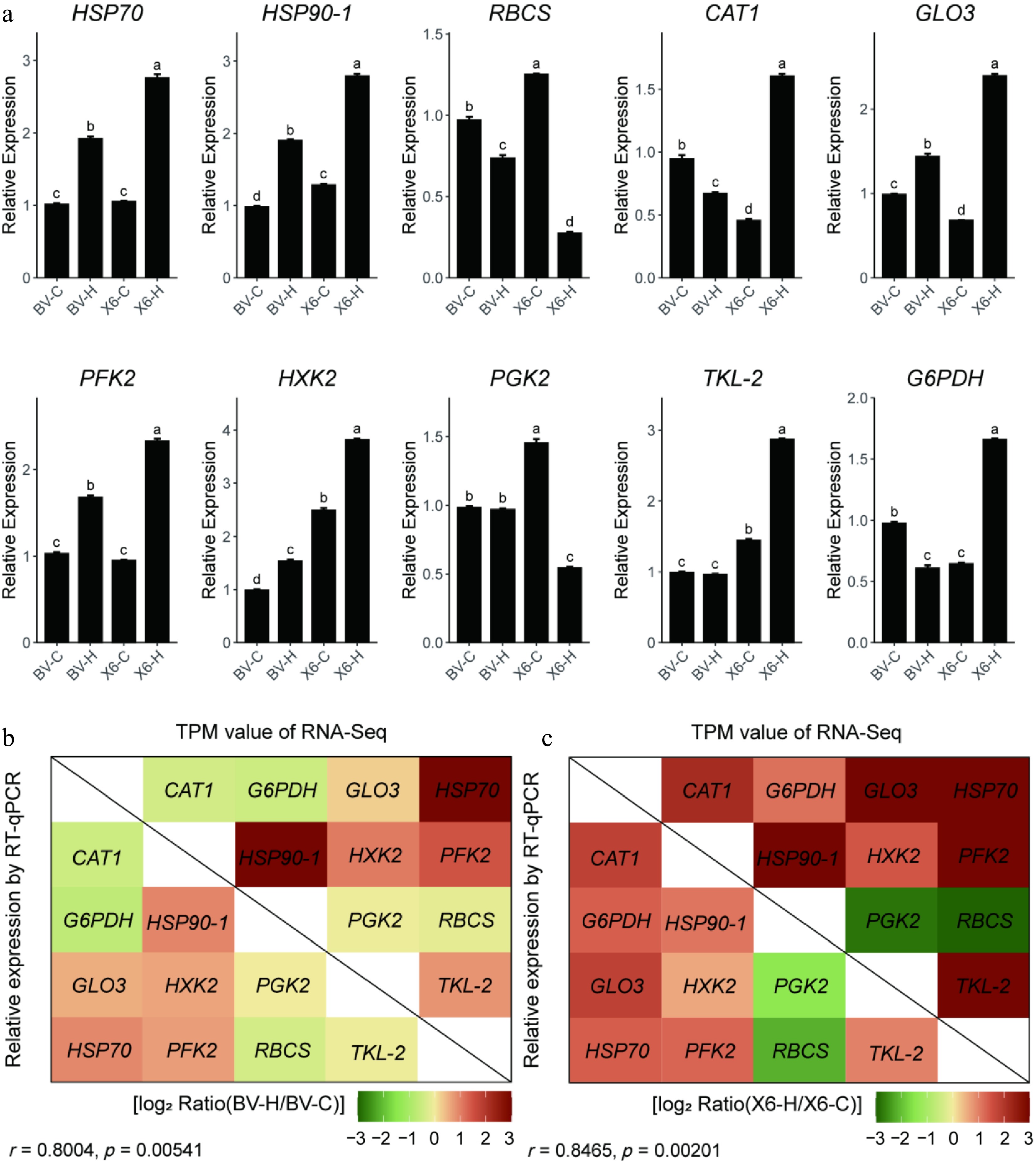 • To further validate the reliability of the RNA-seq data, the relative expression levels of ten DEGs were quantified using real-time quantitative PCR (RT-qPCR). As shown in Fig. 4a, the expression patterns obtained by RT-qPCR mirrored those revealed by RNA-seq. For the DEGs identified in groups of 'X6-H' vs 'X6-C' and 'BV-H' vs 'BV-C', the correlation indexes between relative expression values (RT-qPCR) and TPM values (RNA-seq) were 0.85 and 0.80 (p < 0.01), respectively (Fig. 4b, c). This result confirmed the reliability of the RNA-seq data.