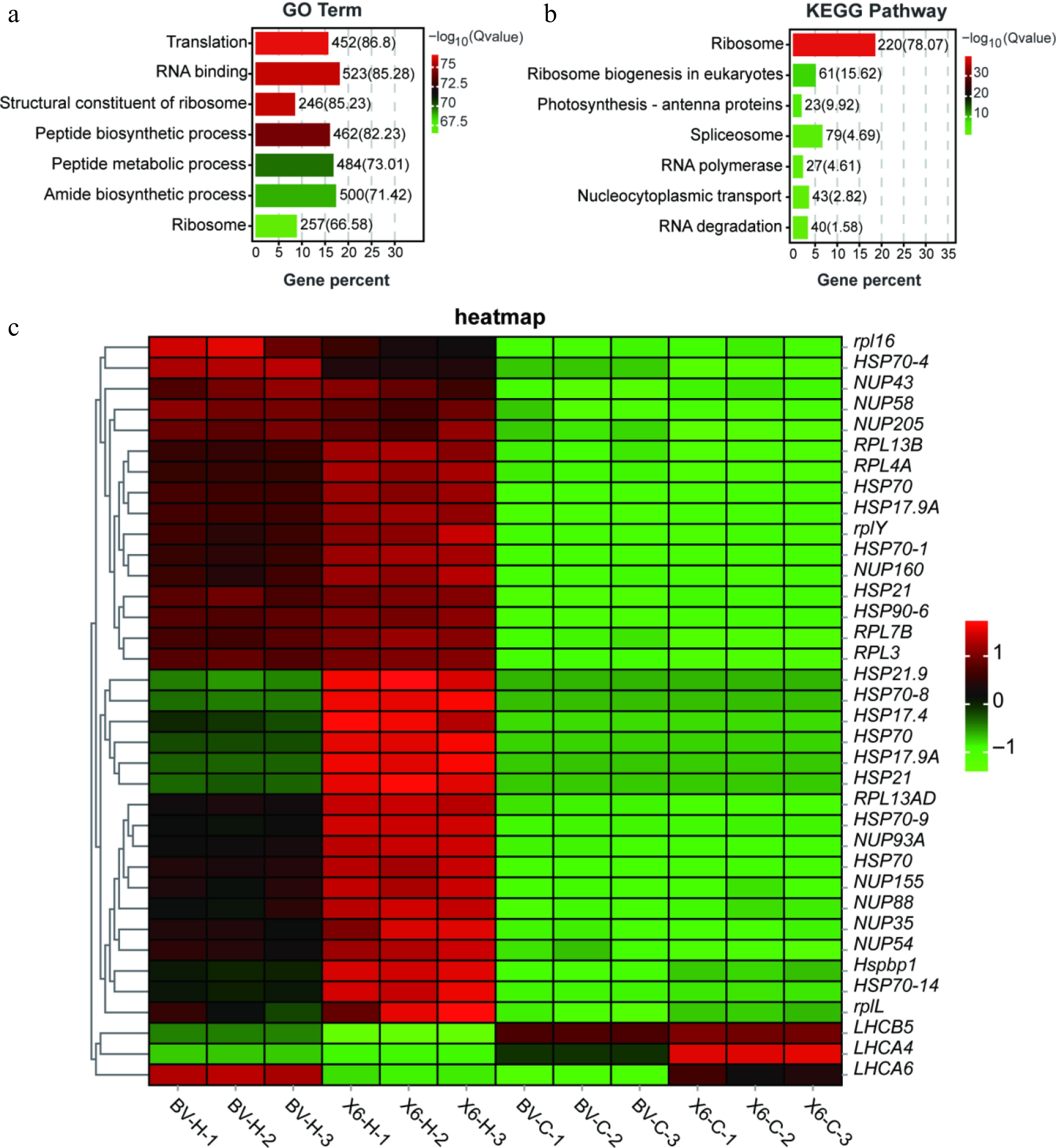 • The 5,399 common heat-responsive DEGs between the two ryegrass varieties were analysed using the GO and KEGG enrichment analysis. Accordingly, the GO analysis showed that the DEGs were mostly enriched in translation, RNA binding, ribosomal structural components, and general cellular metabolic processes (such as peptide synthesis, peptide metabolism, and amino acid synthesis) (Fig. 5a). The KEGG enrichment analysis showed that the significantly enriched pathways were mostly related to genetic information processing and cellular metabolism, including ribosomes, spliceosomes, ribosome biogenesis in eukaryotes, photosynthetic antenna proteins, RNA polymerase, nucleocytoplasmic transport, and RNA degradation (Fig. 5b). Additionally, many heat shock proteins (HSPs), nucleoporin proteins (NUPs), light-harvesting complex proteins (LHCs), and large ribosomal subunit proteins (RPLs) were among the common heat-responsive DEGs (Fig. 5c), suggesting protein folding and stability, nuclear export/entry regulation, photosynthesis, and protein biosynthesis were common early heat-responsive genes in both ryegrass varieties. Specifically, six commonly heat-inducible HSP genes (i.e., HSP21.9, HSPF70-8, HSP17.4, HSP70, HSP17.9, and HSP21) demonstrated higher up-regulated degrees in 'X6-H' vs 'X6-C' group than the 'BV-H' vs 'BV-C' group (Fig. 5c).